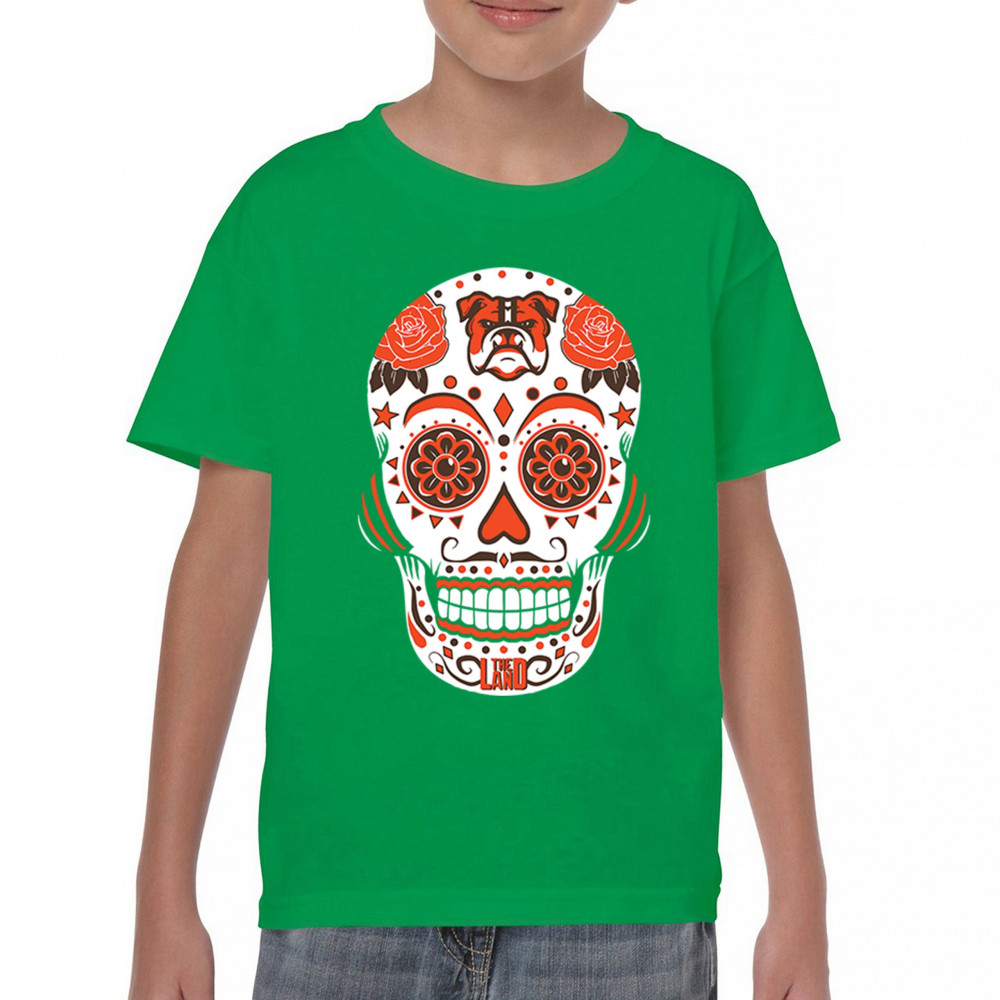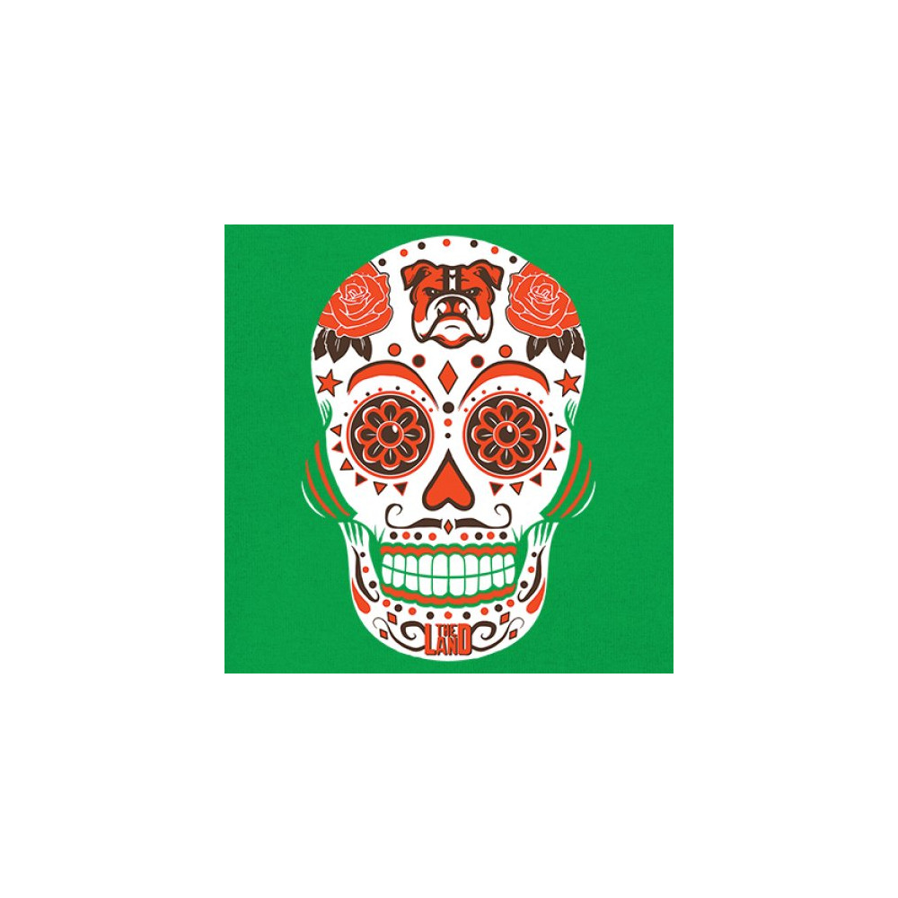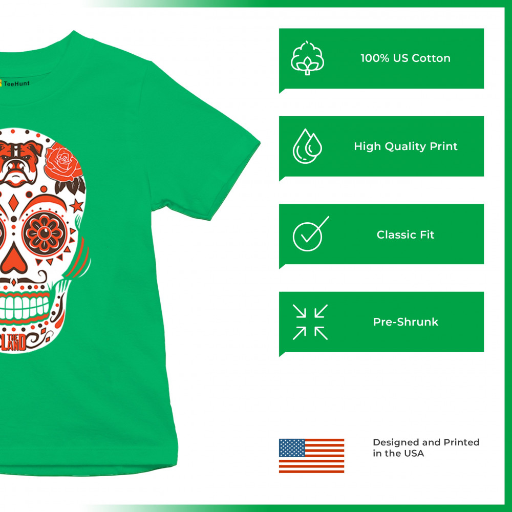 Cleveland Sugar Skull with Lake Erie pride, Rust Belt football grit, orange & brown tradition, playoff vibes, and Game Day passion.