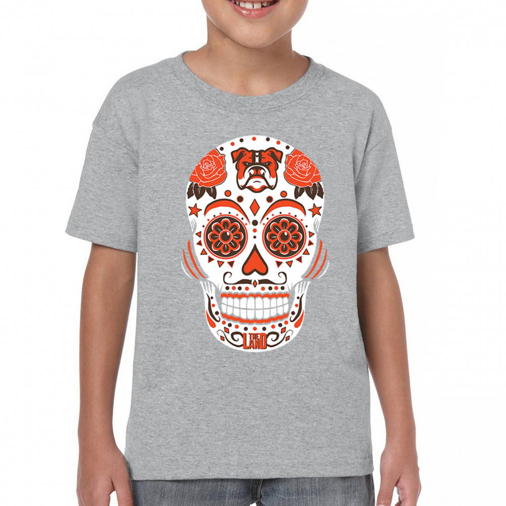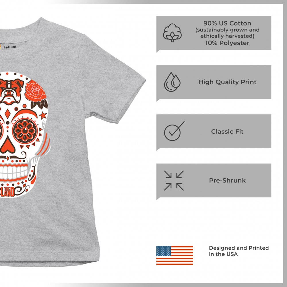 Cleveland Sugar Skull with Lake Erie pride, Rust Belt football grit, orange & brown tradition, playoff vibes, and Game Day passion.