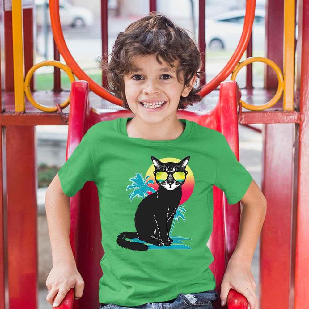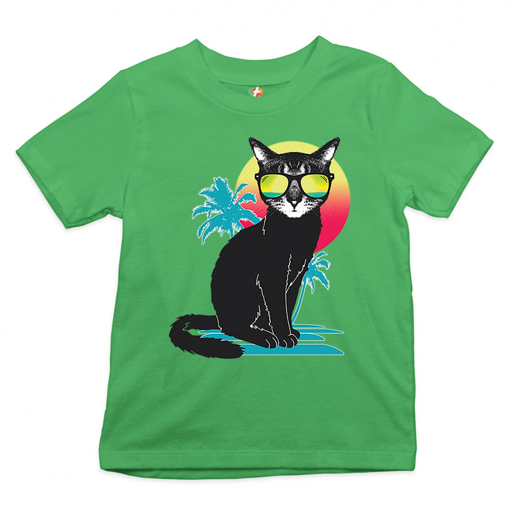 COOL SUMMER CAT youth t-shirt neon kitty on a beach animal lovers kids green