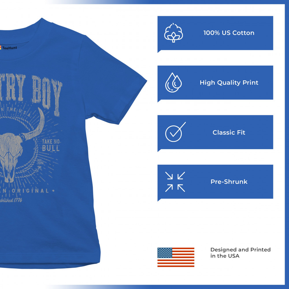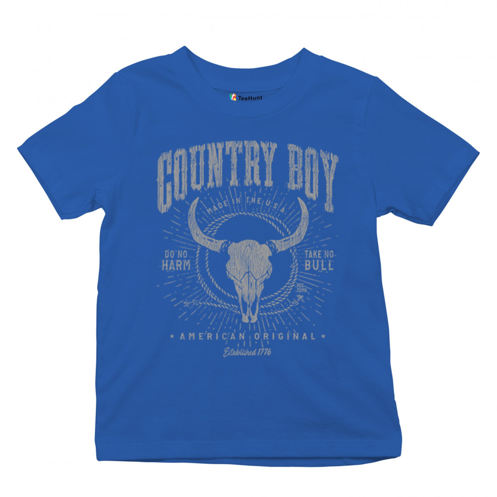 Bold country boy design with bull skull, distressed western style, patriotic grit, and the phrase “Do No Harm, Take No Bull.â€