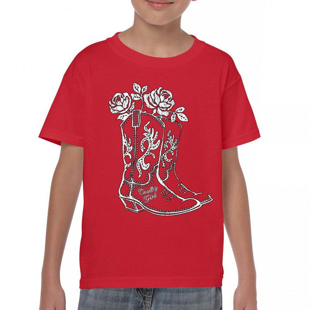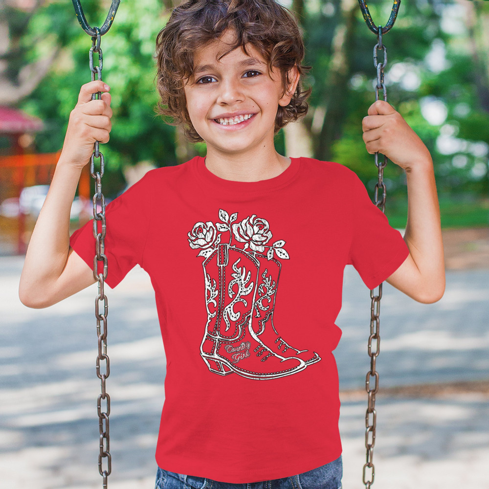 Rustic country girl design with boots and roses. Vintage western art perfect for cowgirls, rodeos, fairs, and outdoor country events.