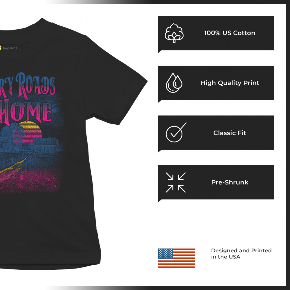Bold and nostalgic, this "Country Roads Take Me Home" design blends retro-style typography with a vivid sunset scene. It’s perfect for fans of Americana music, scenic travel, and rural freedom. Great for road trips, camping, music events, or everyday wear that channels the spirit of country life.