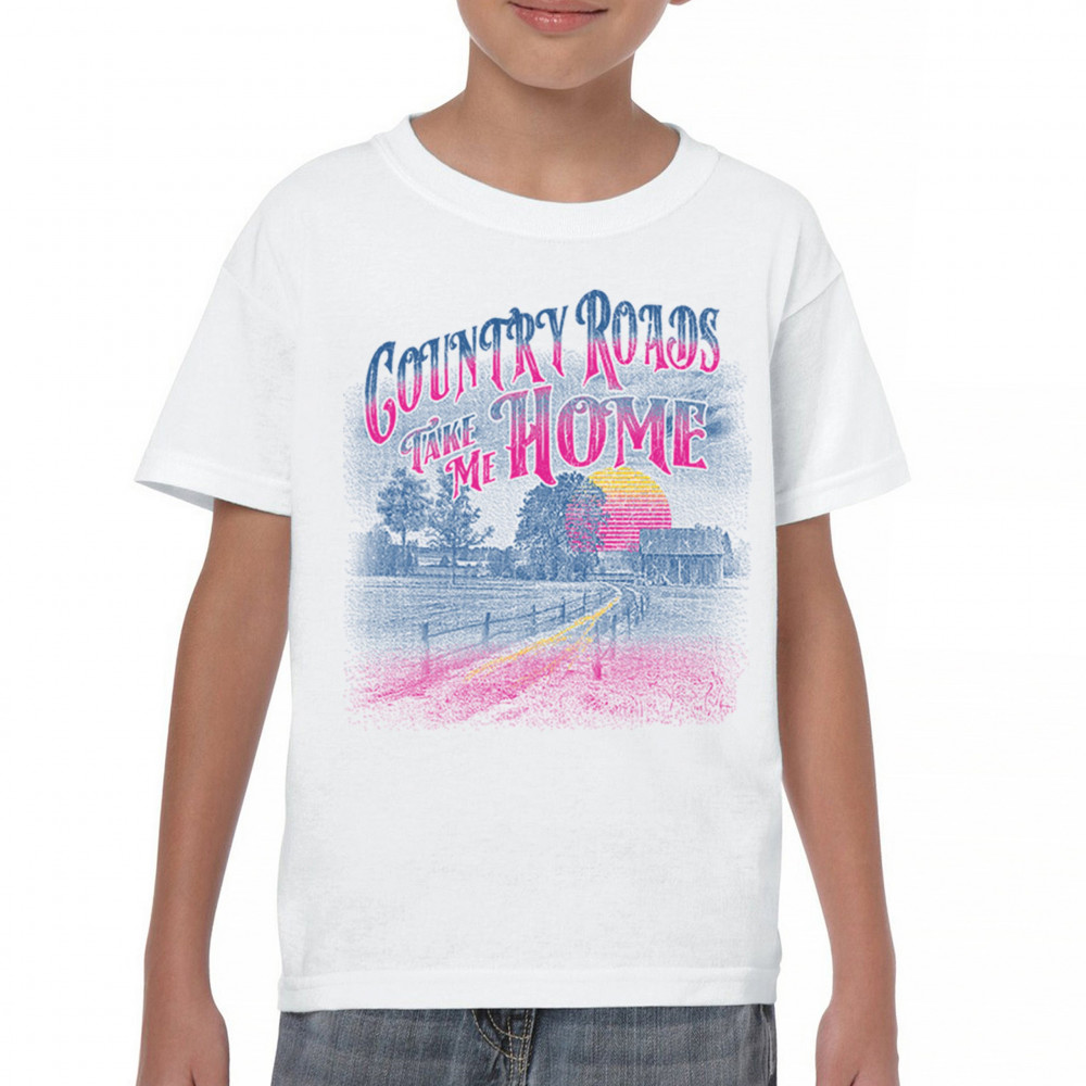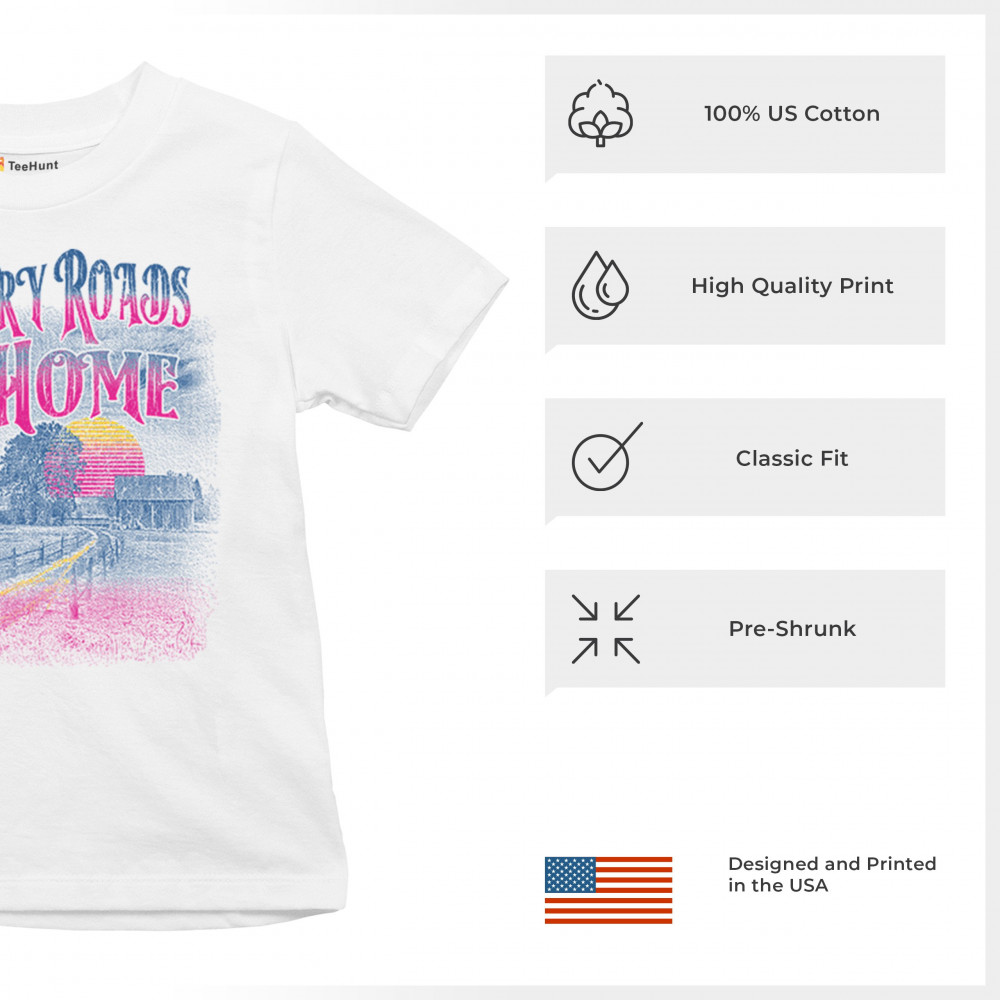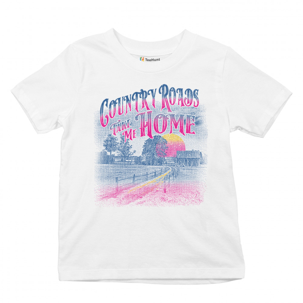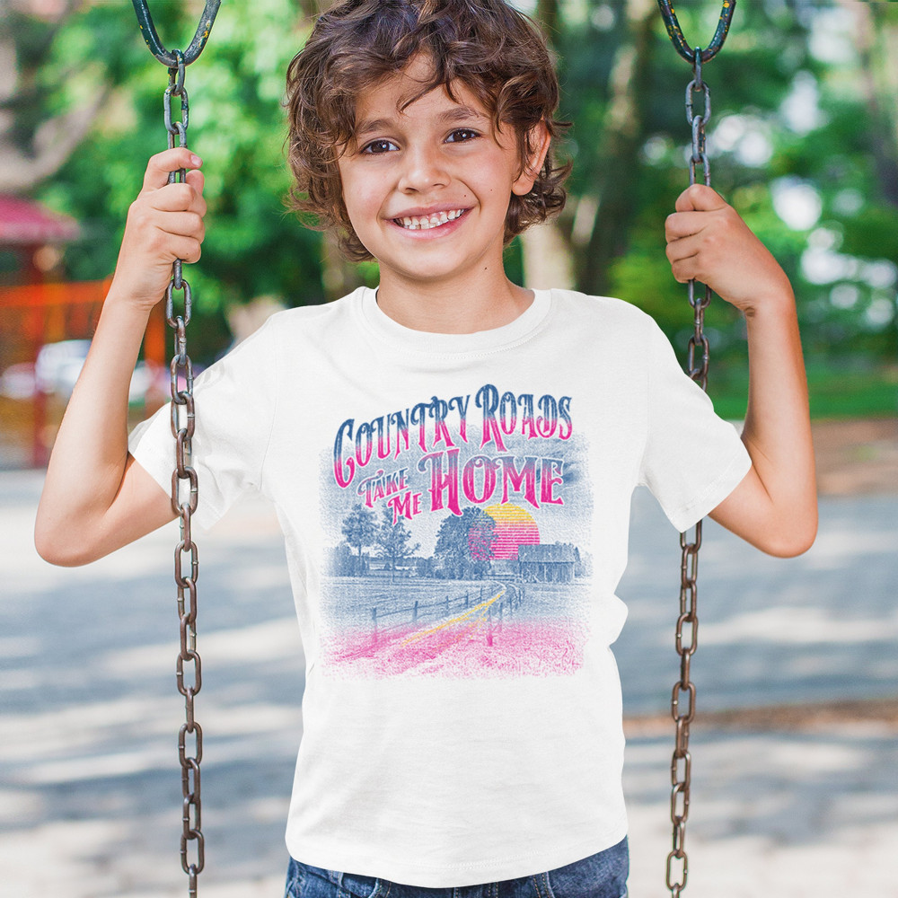 Retro sunset "Country Roads Take Me Home" design for road trip lovers, Americana fans, and country music souls. Bright, bold, and nostalgic.