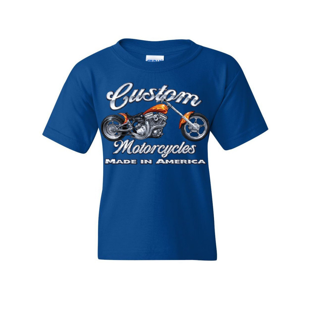 CUSTOM MOTORCYCLES youth t-shirt biker chopper american tradition usa kids tee royal blue
