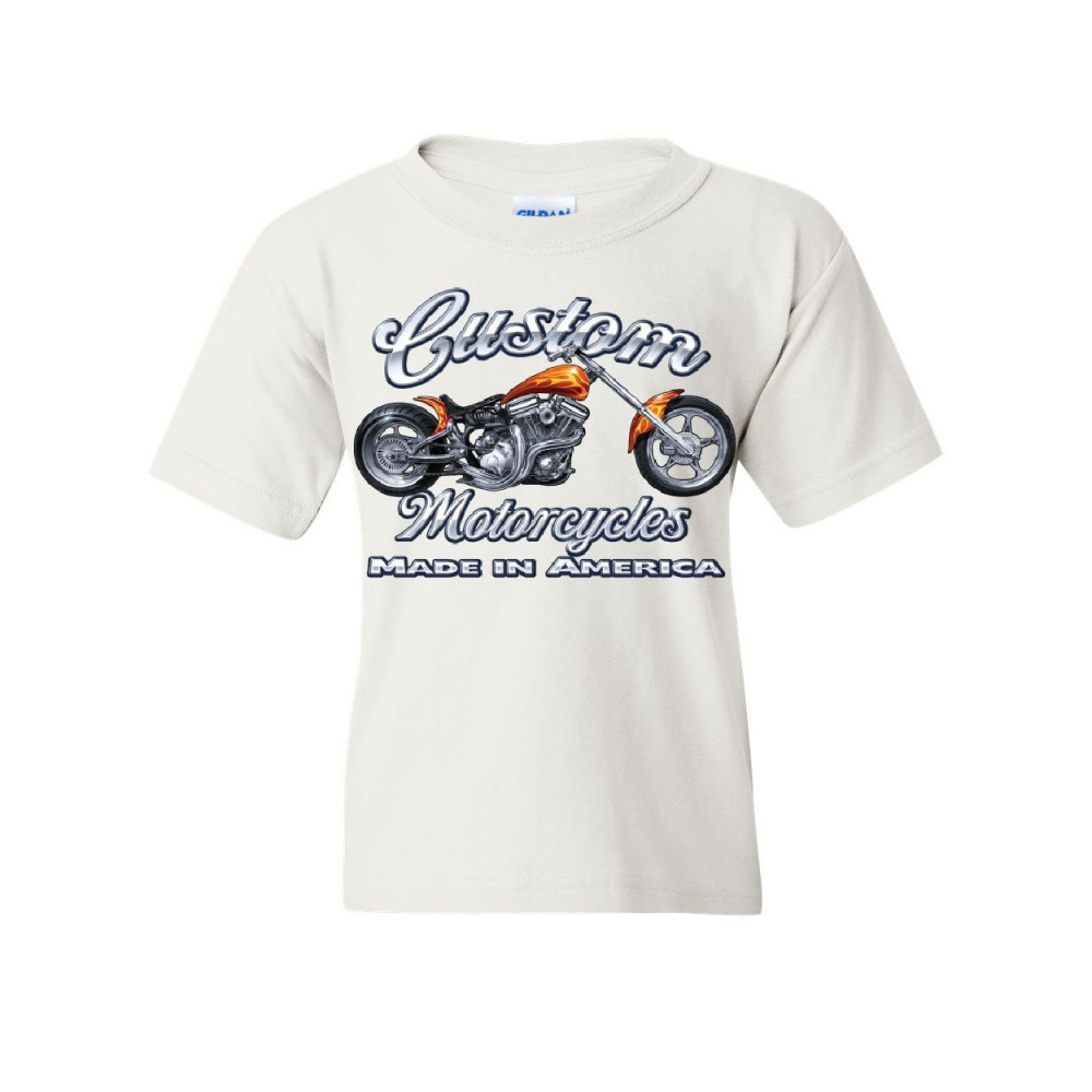 CUSTOM MOTORCYCLES youth t-shirt biker chopper american tradition usa kids tee white
