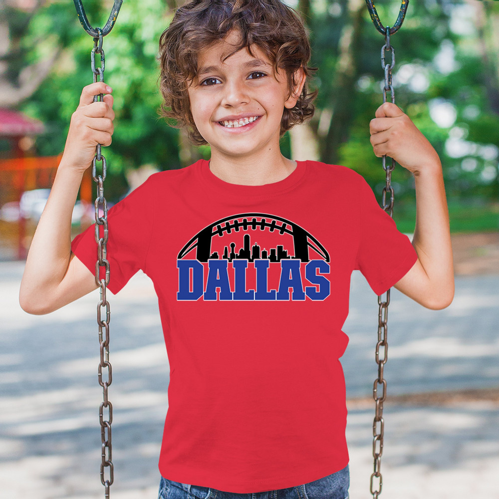 Show off your Dallas pride with a bold football-themed design featuring the city's skyline. Perfect for game days, tailgates, and passionate fans.