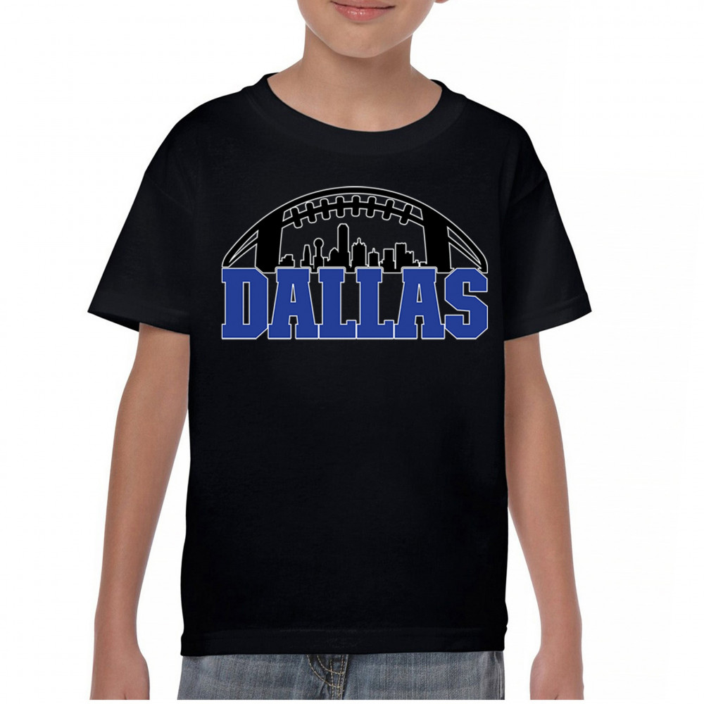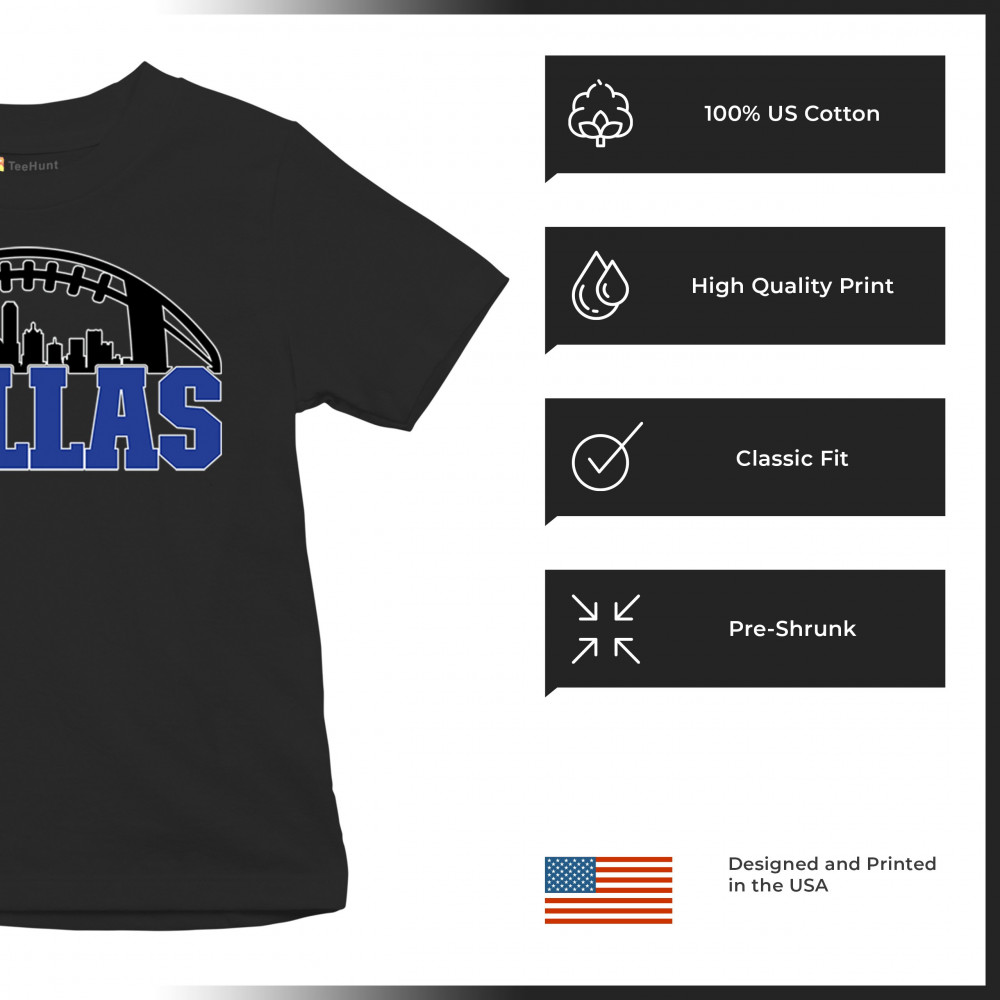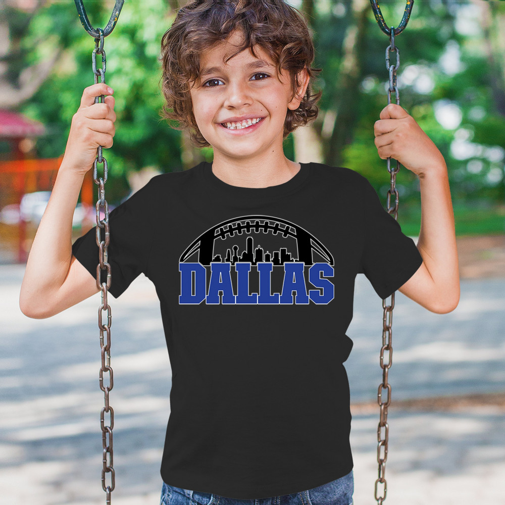 Show off your Dallas pride with a bold football-themed design featuring the city's skyline. Perfect for game days, tailgates, and passionate fans.
