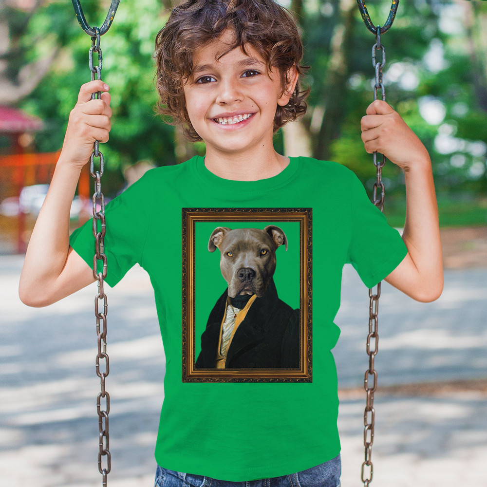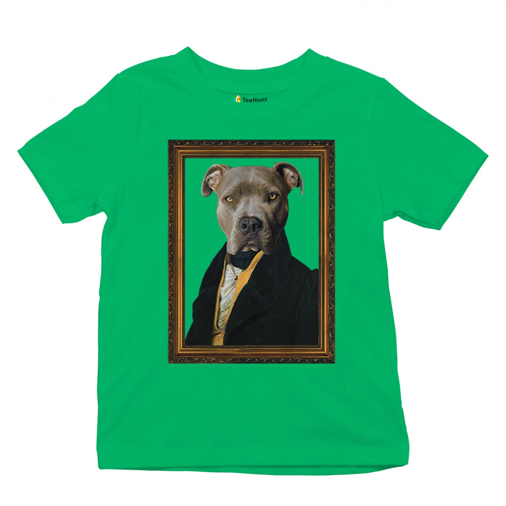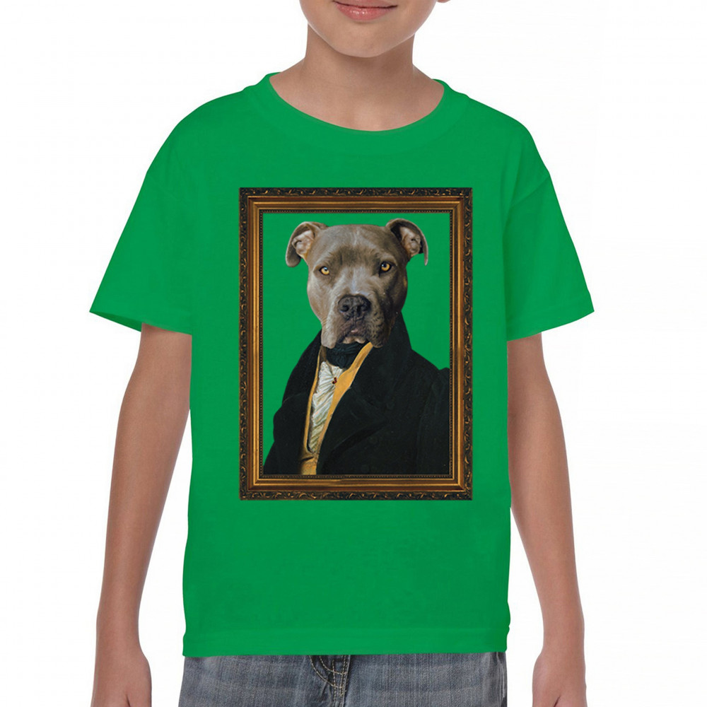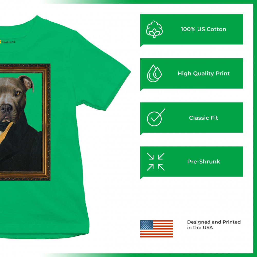 Unique pit bull portrait in 18th-century attire, blending humor and elegance for pet lovers and history enthusiasts. Perfect for home or office decor.