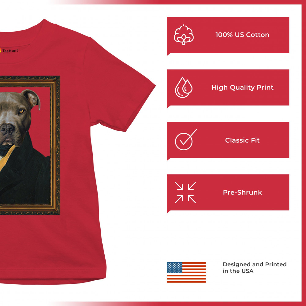 Unique pit bull portrait in 18th-century attire, blending humor and elegance for pet lovers and history enthusiasts. Perfect for home or office decor.