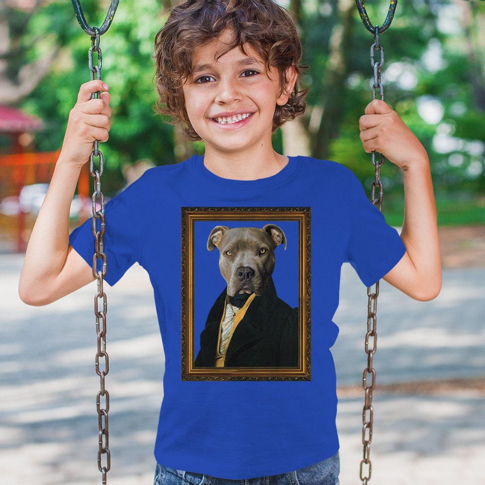 Unique pit bull portrait in 18th-century attire, blending humor and elegance for pet lovers and history enthusiasts. Perfect for home or office decor.