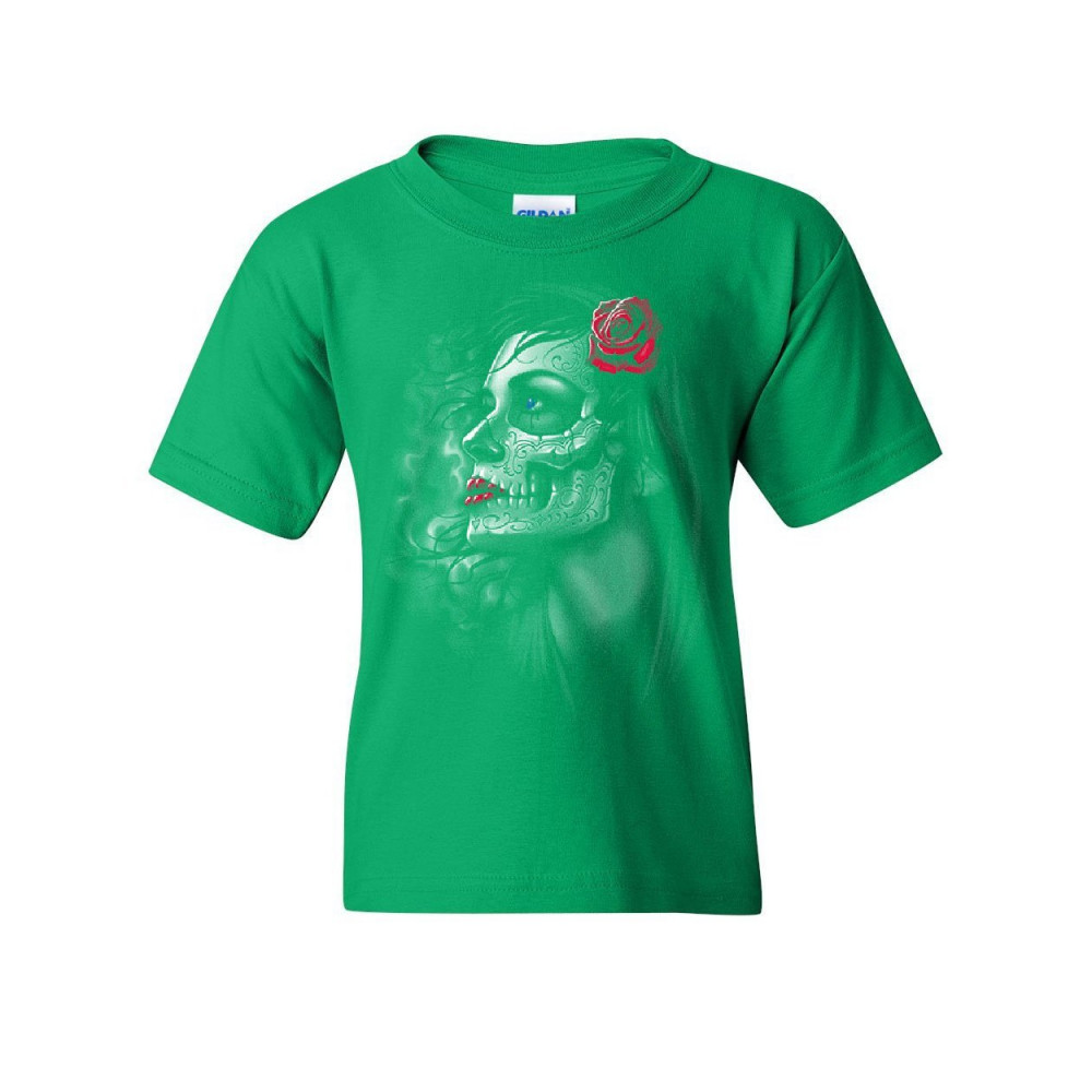 DAY OF THE DEAD GIRL youth t-shirt skull face dia de los muertos roses kids tee green