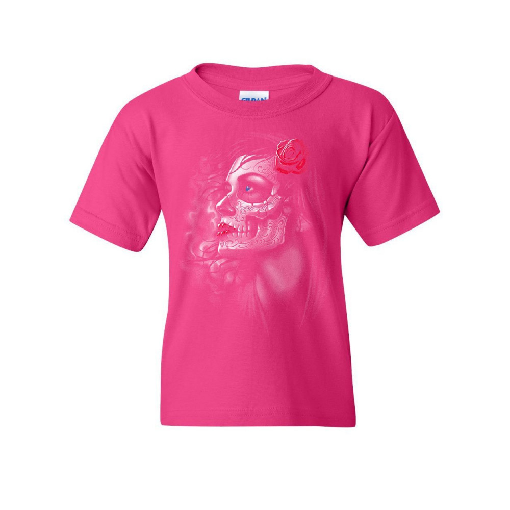 DAY OF THE DEAD GIRL youth t-shirt skull face dia de los muertos roses kids tee pink