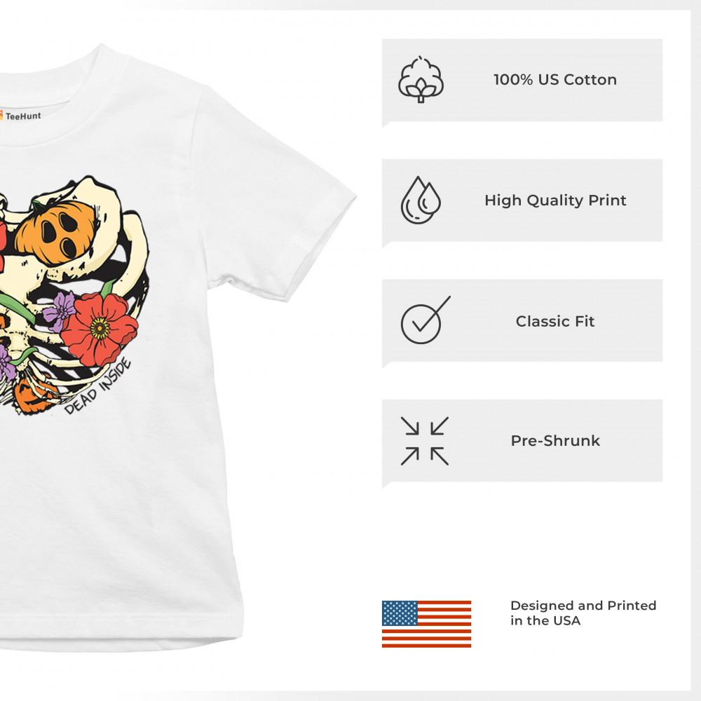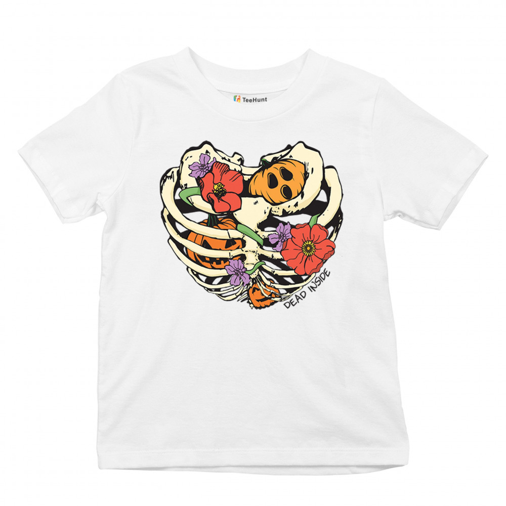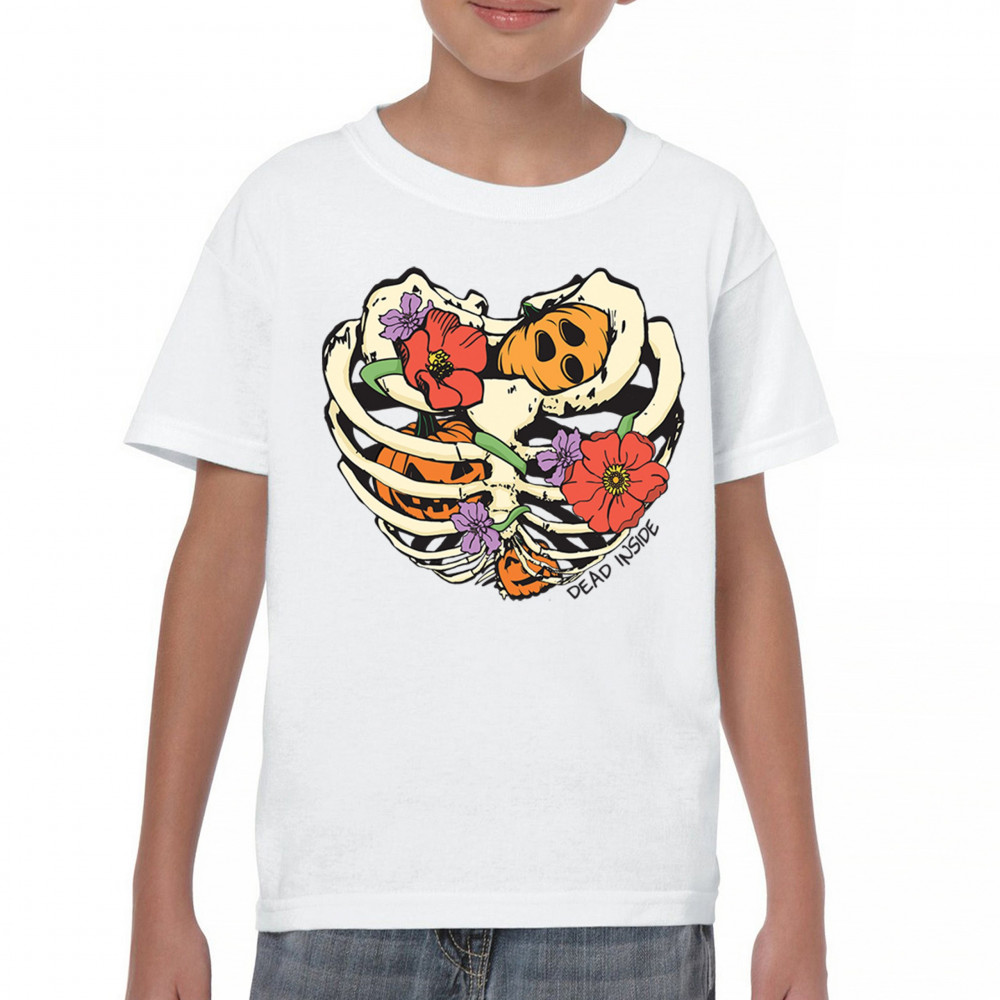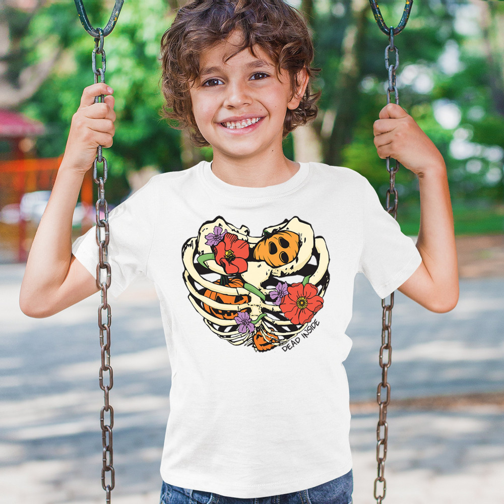 Celebrate Halloween with a quirky and cute design featuring a skeleton ribcage filled with pumpkins and flowers. Perfect for spooky season lovers!