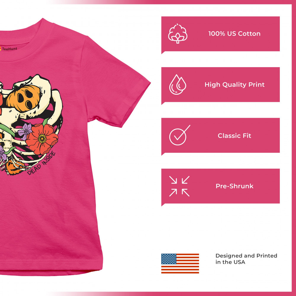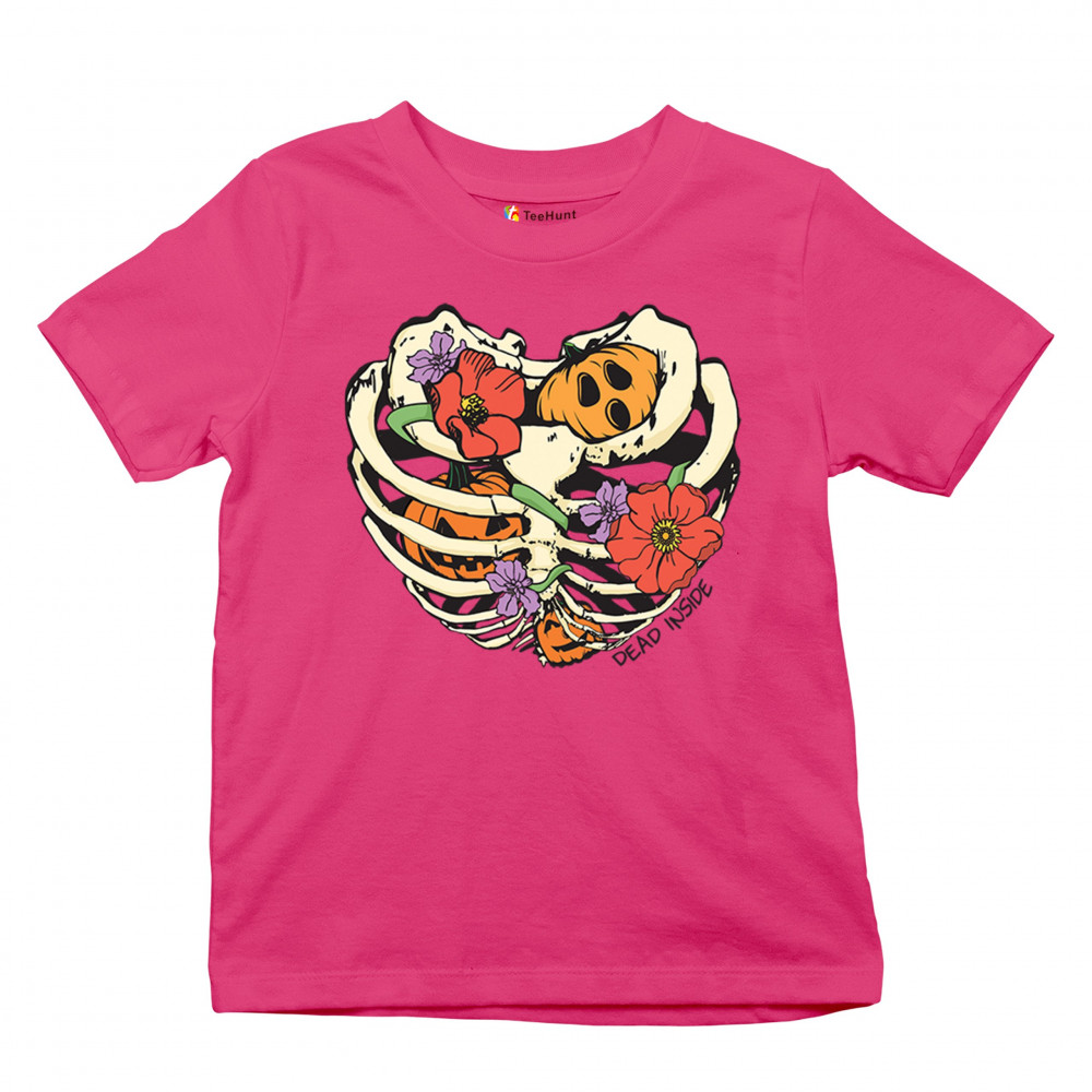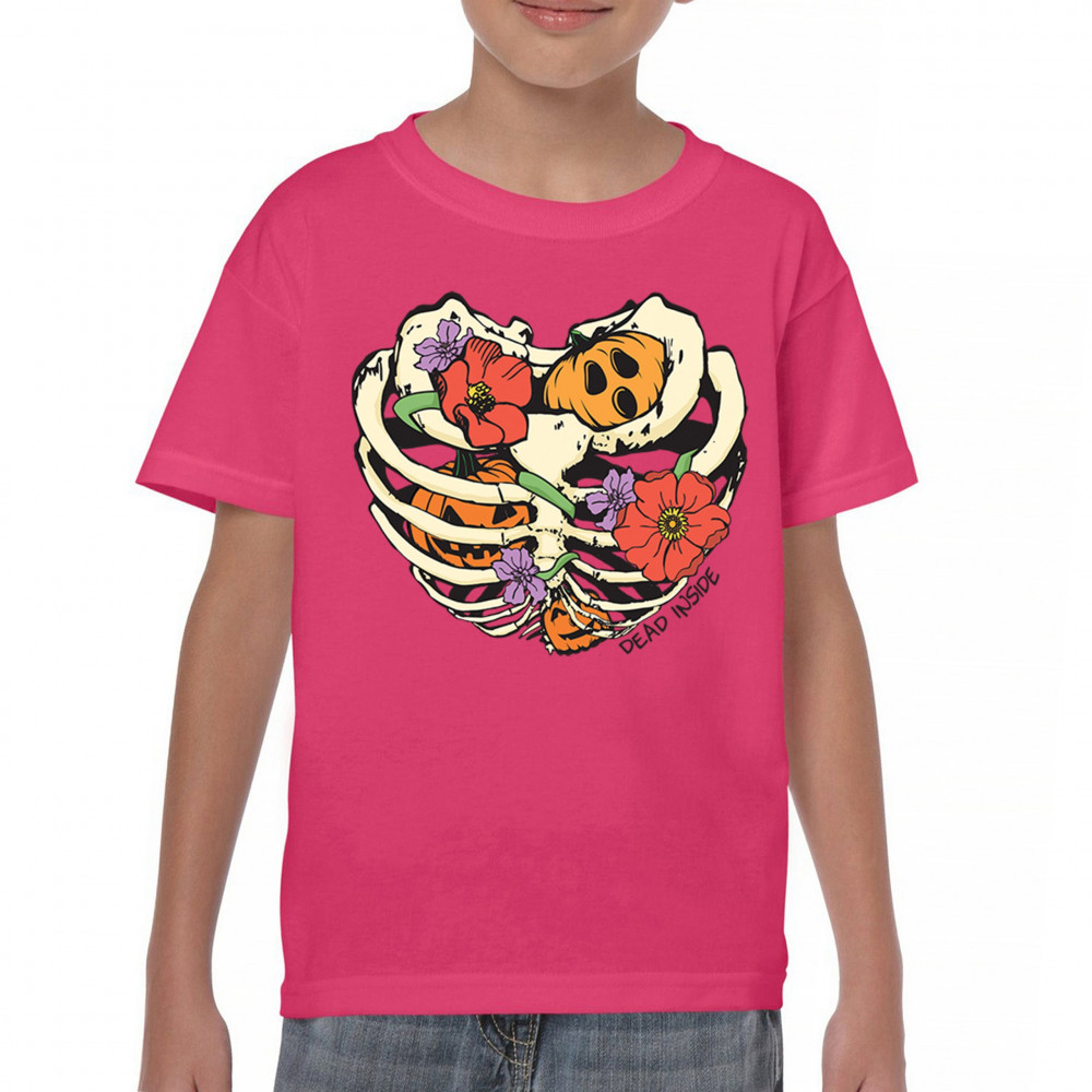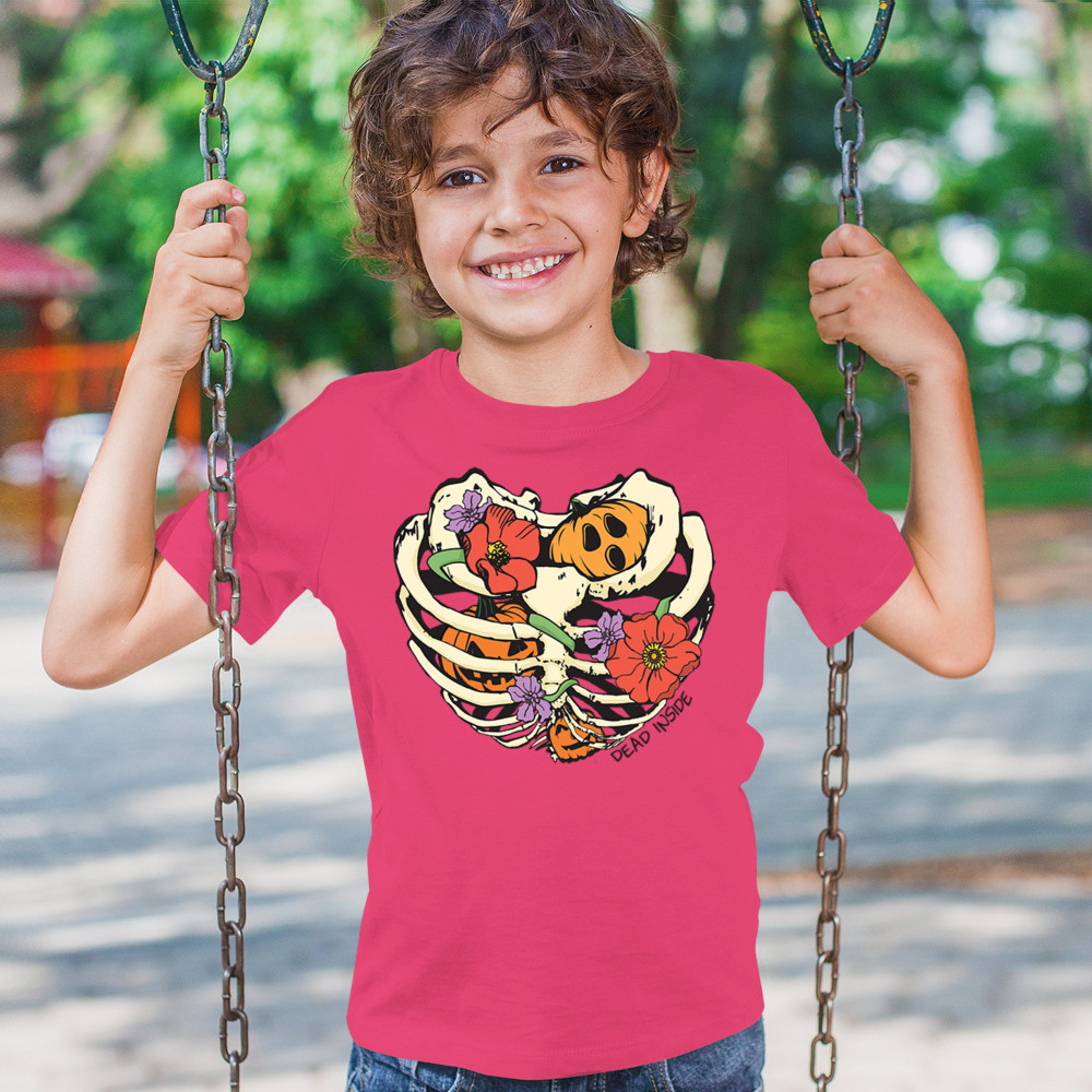 Celebrate Halloween with a quirky and cute design featuring a skeleton ribcage filled with pumpkins and flowers. Perfect for spooky season lovers!