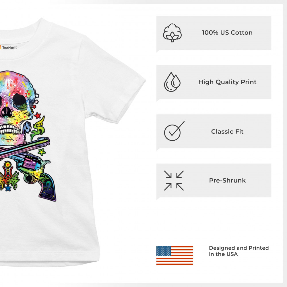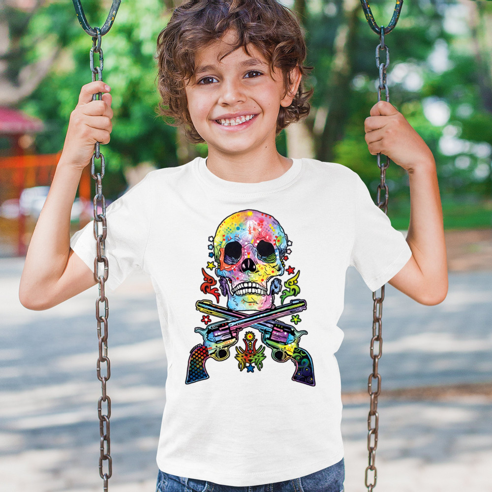 DEAN RUSSO ART SKULL AND GUNS youth t-shirt colorful 2nd amendment kids white