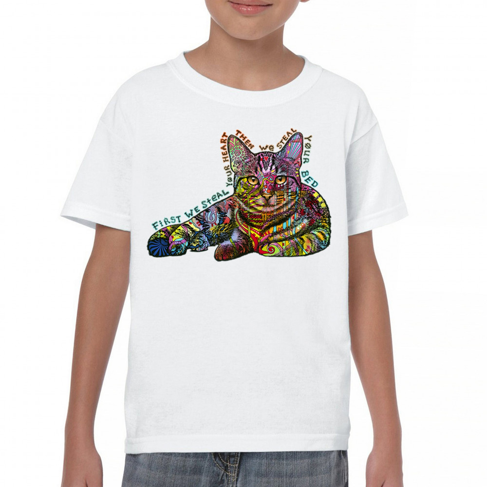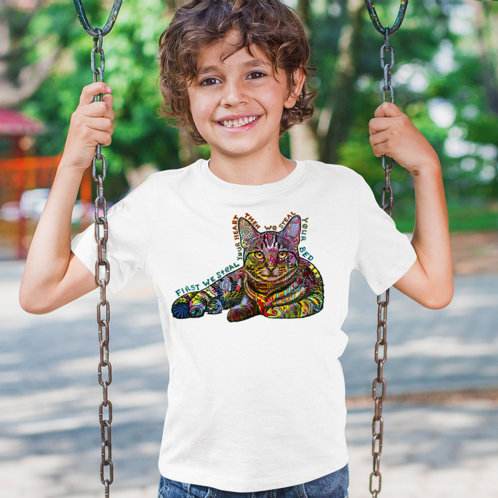DEAN RUSSO CUTE NEON CAT youth t-shirt first we steal your heart kitten kids white