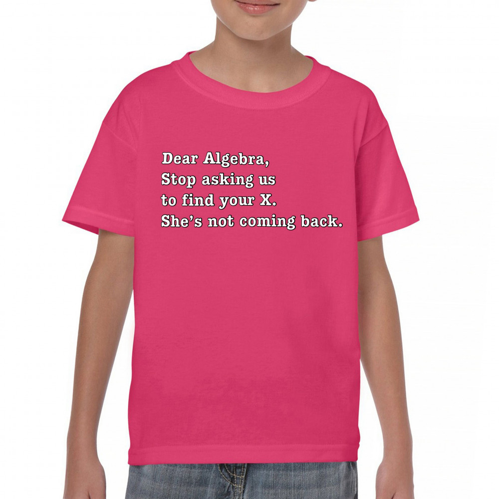DEAR ALGEBRA STOP ASKING US TO FIND YOUR X youth t-shirt funny humor kids pink