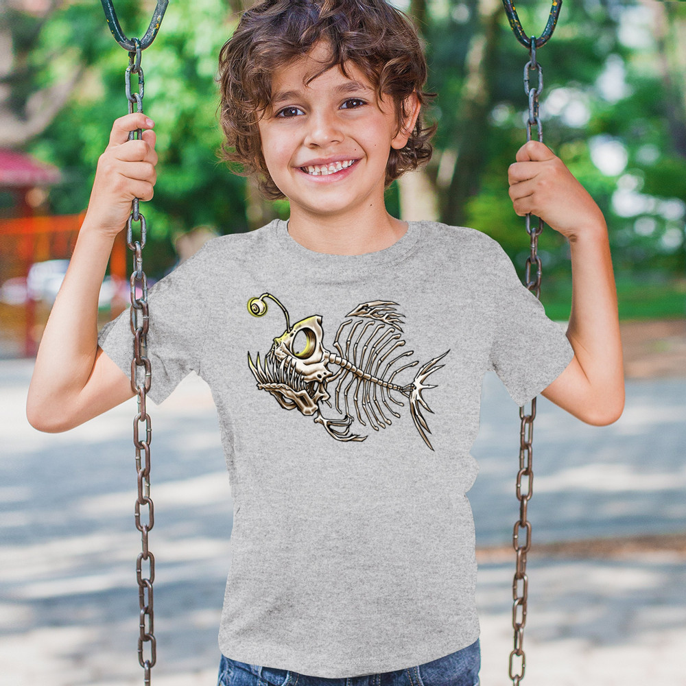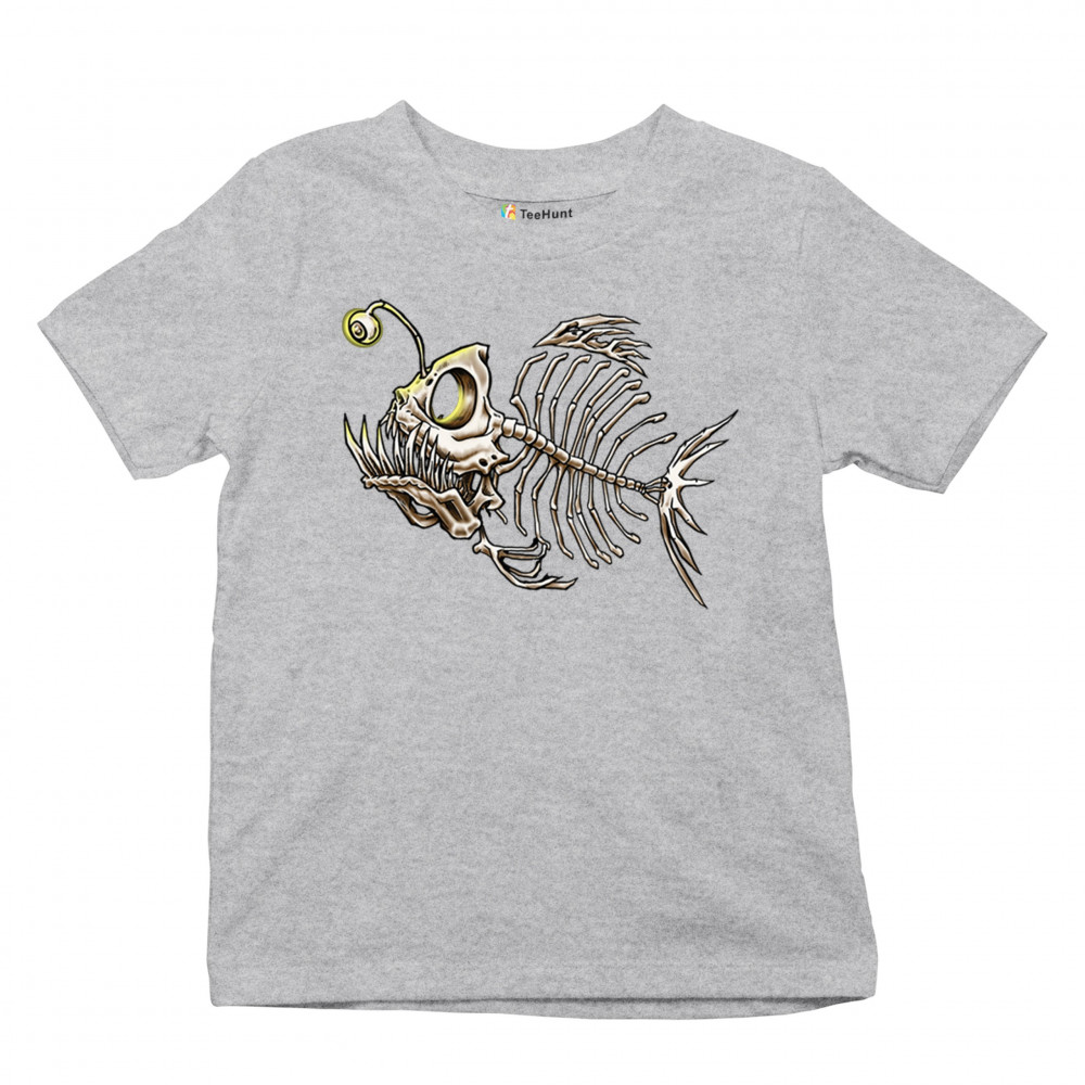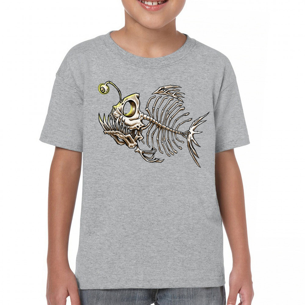 Creepy angler fish skeleton with glowing eye and horror bones. Perfect for sea lovers, divers, Halloween, and marine biology fans.