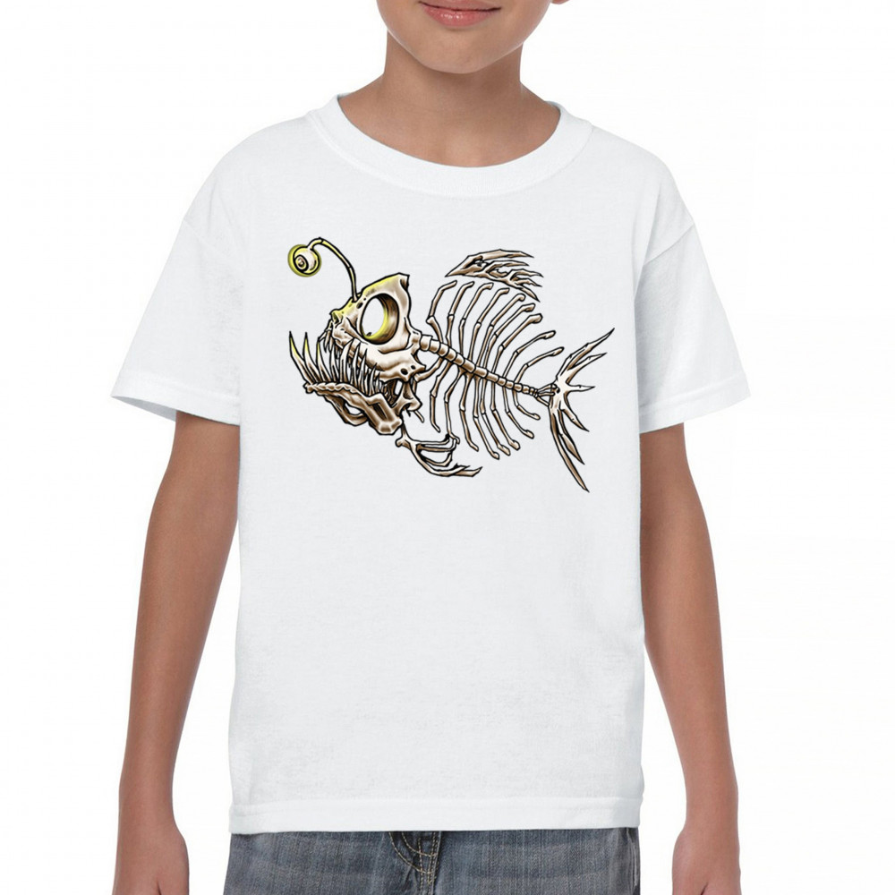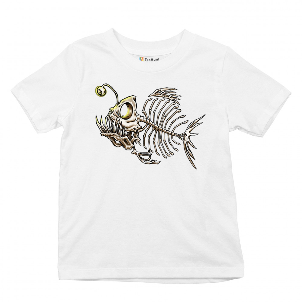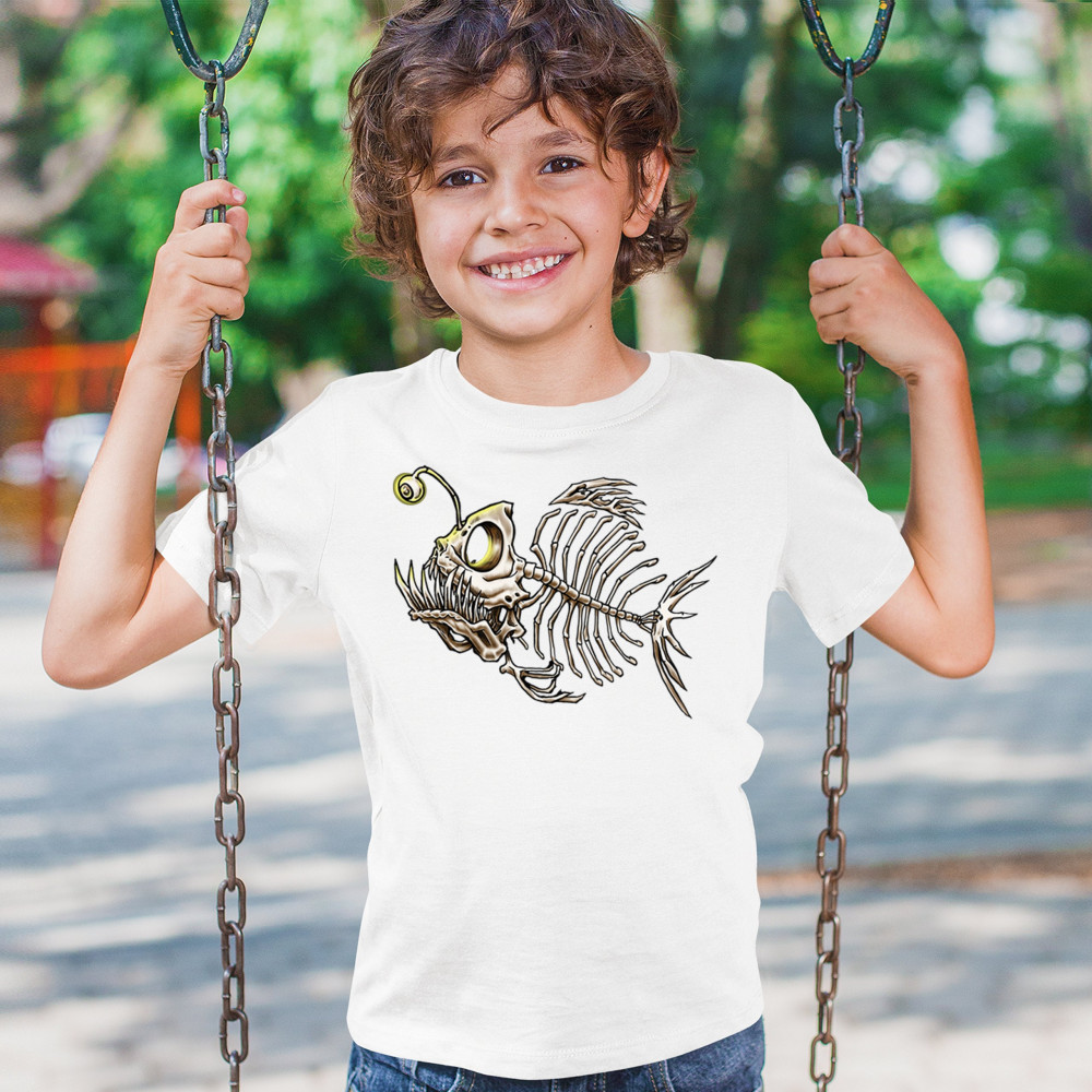 Creepy angler fish skeleton with glowing eye and horror bones. Perfect for sea lovers, divers, Halloween, and marine biology fans.