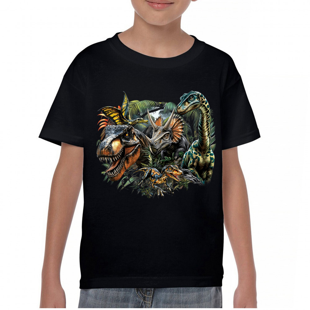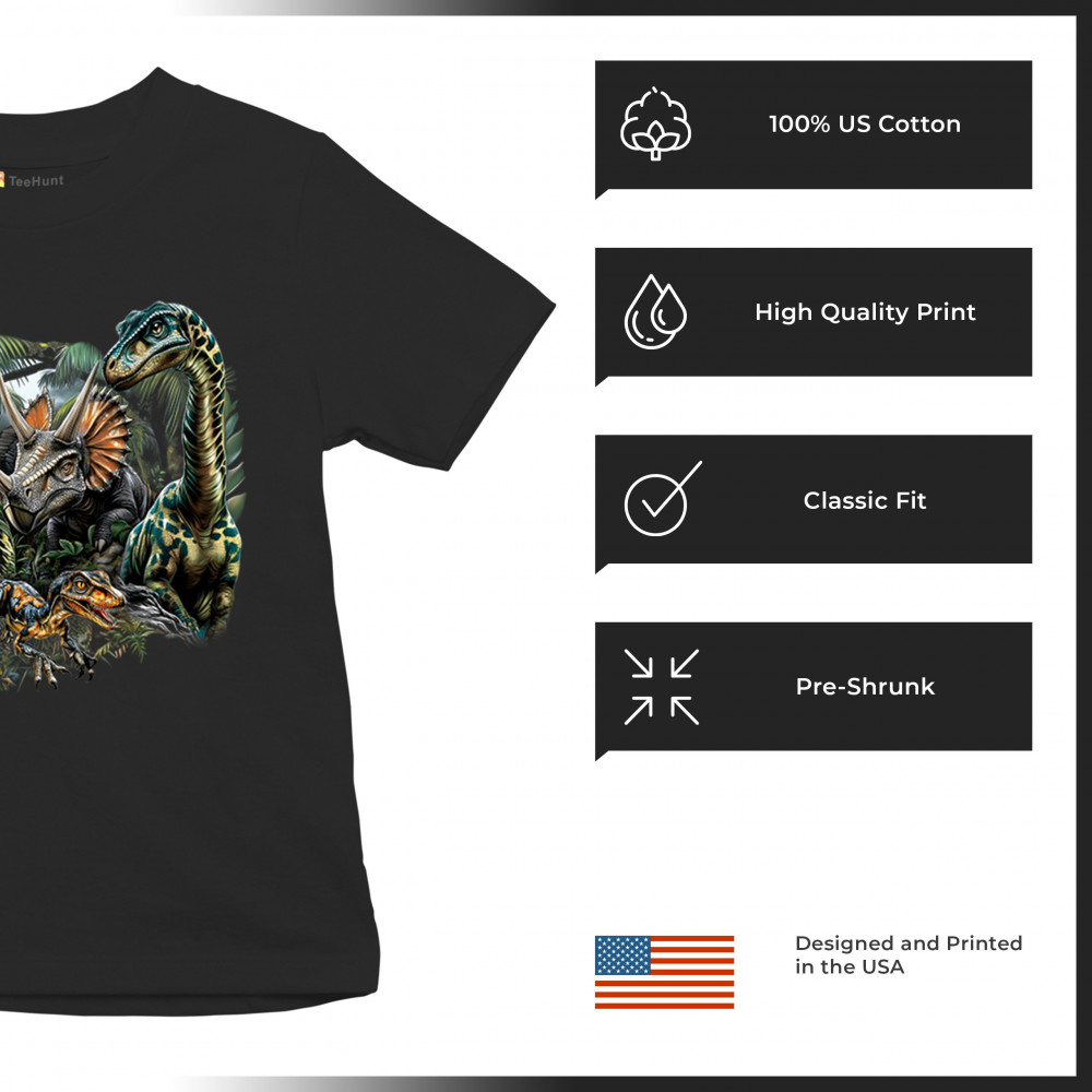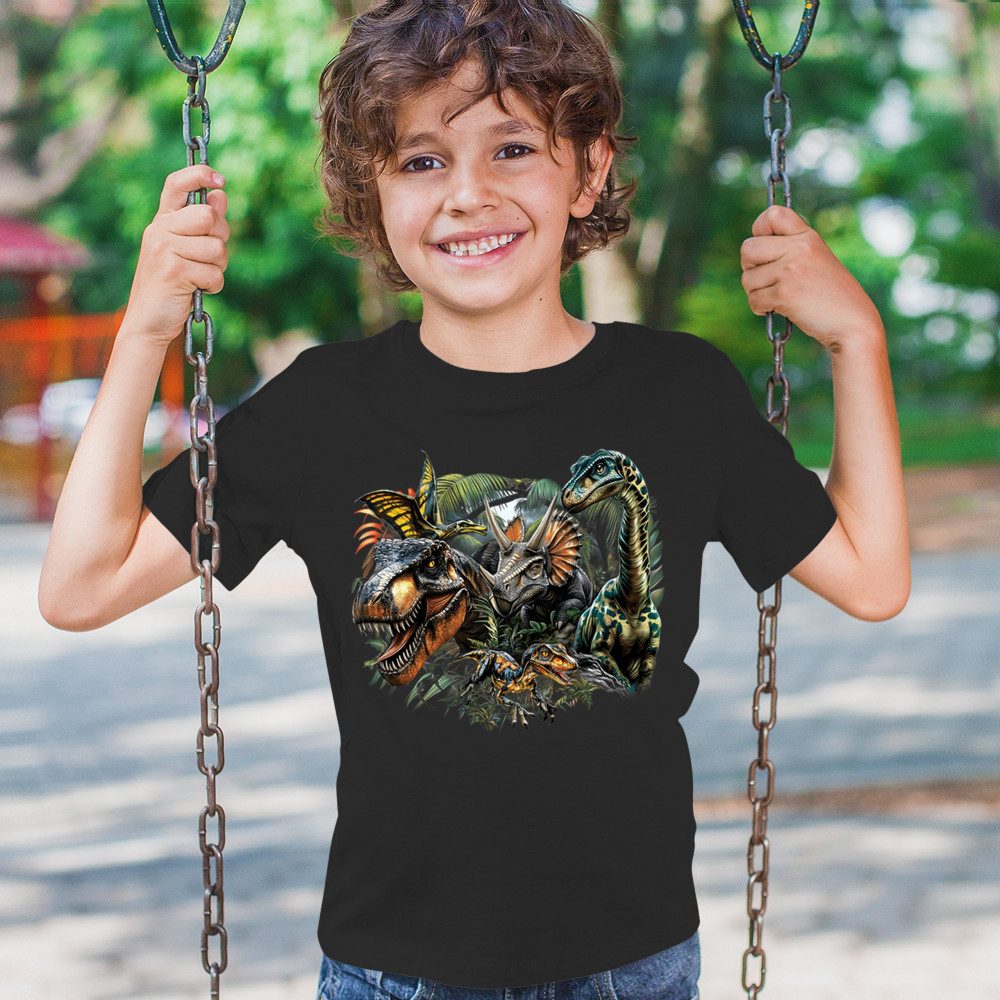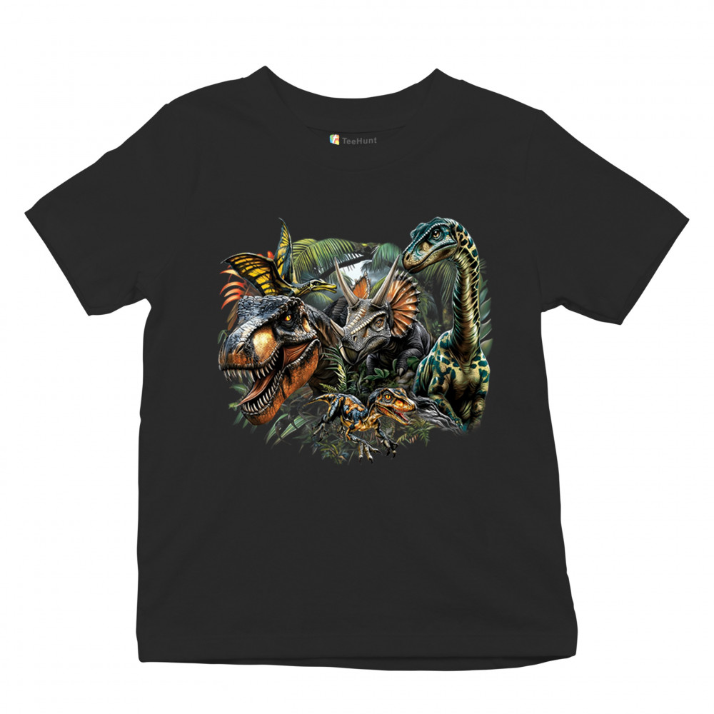 Get prehistoric with this electrifying design featuring a full dino squad in vibrant jungle detail. Includes t rex, triceratops, raptor, brachiosaurus, and pteranodon, all surrounded by tropical foliage. A perfect pick for dinosaur fans, fossil hunters, Jurassic birthday parties, or anyone who loves bold, wild, nature-themed art.