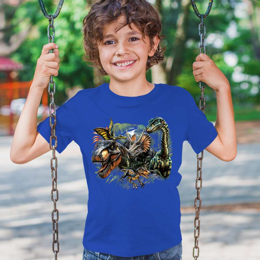 Bold jungle dinosaur design featuring t rex, triceratops, raptor, brachiosaurus, and pteranodon. Perfect for parties, digs, and dino fans.