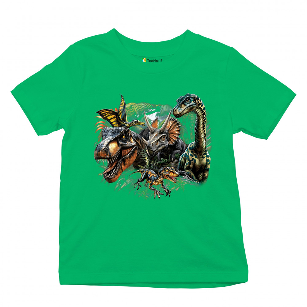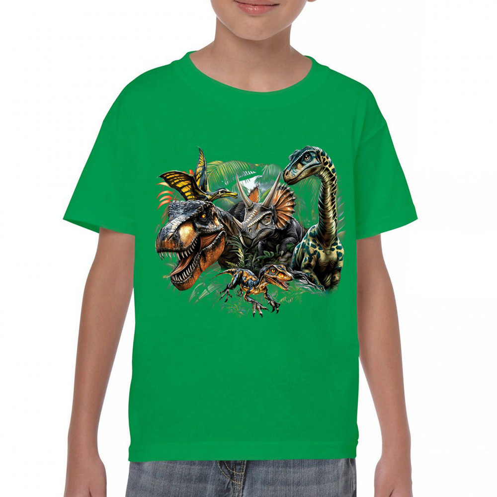 Bold jungle dinosaur design featuring t rex, triceratops, raptor, brachiosaurus, and pteranodon. Perfect for parties, digs, and dino fans.