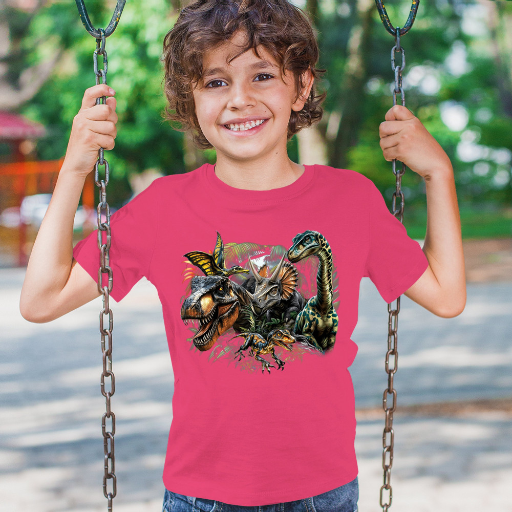 Bold jungle dinosaur design featuring t rex, triceratops, raptor, brachiosaurus, and pteranodon. Perfect for parties, digs, and dino fans.