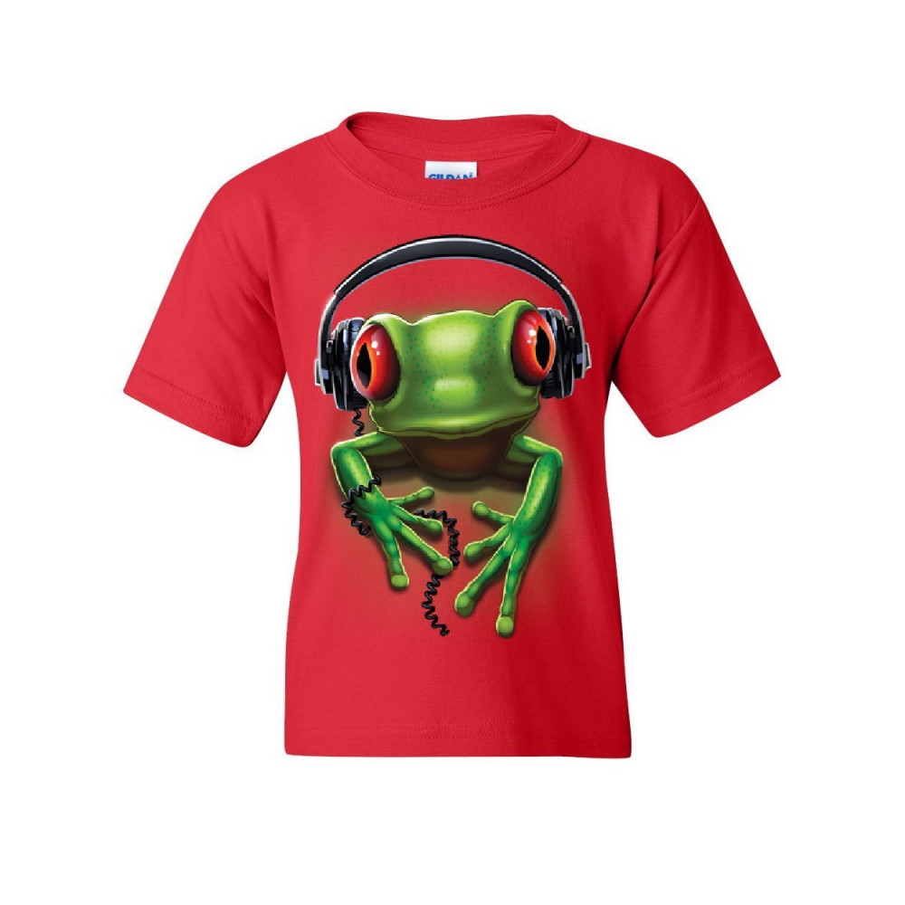 DJ FROG WITH HEADPHONES youth t-shirt cute animal music wildlife rock kids tee red