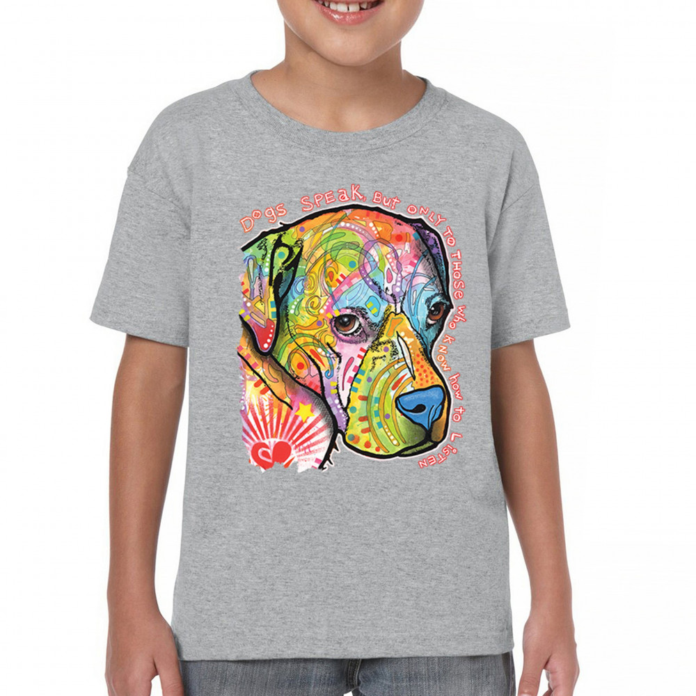 DOGS SPEAK TO THOSE WHO LISTEN youth t-shirt dean russo neon pet puppy kids gray