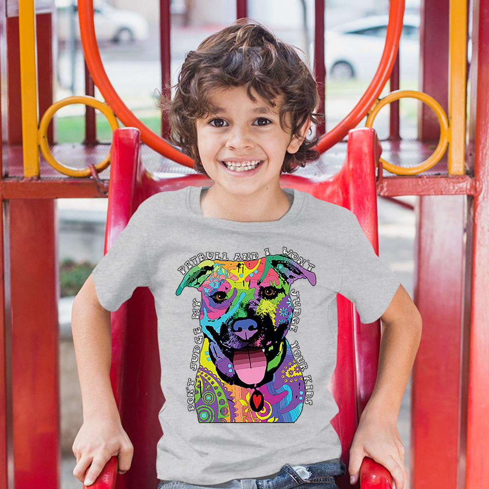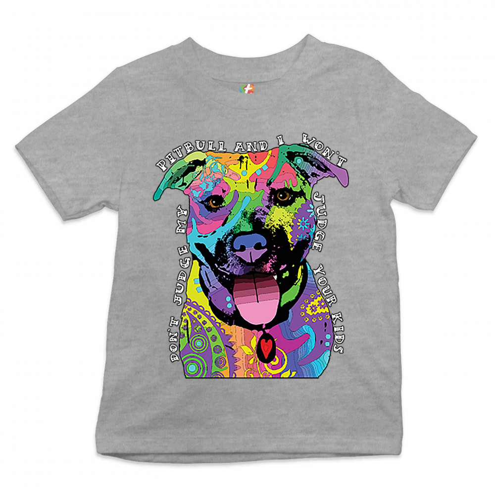 DON'T JUDGE MY PIT BULL youth t-shirt funny andy maxx dog lover pet owner kids gray