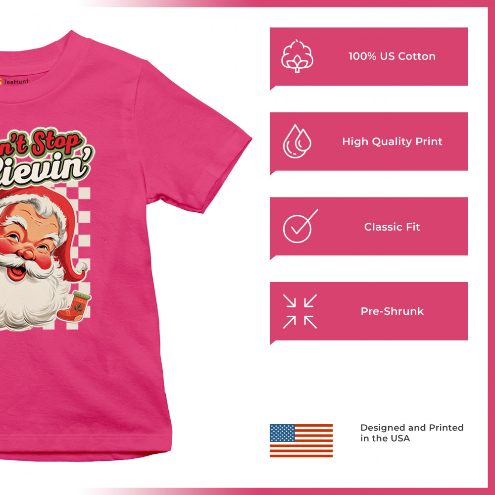 Spread holiday cheer with this “Don’t Stop Believing†Santa Claus shirt that blends classic Christmas spirit with cozy winter charm. Perfect for festive parties, family gatherings, or relaxing by the fire, this design captures Jingle Bells joy, Merry Xmas fun, Santa Claus magic, Reindeer delight, Rudolph glow, Snowman charm, and Christmas tree style for the perfect seasonal outfit.