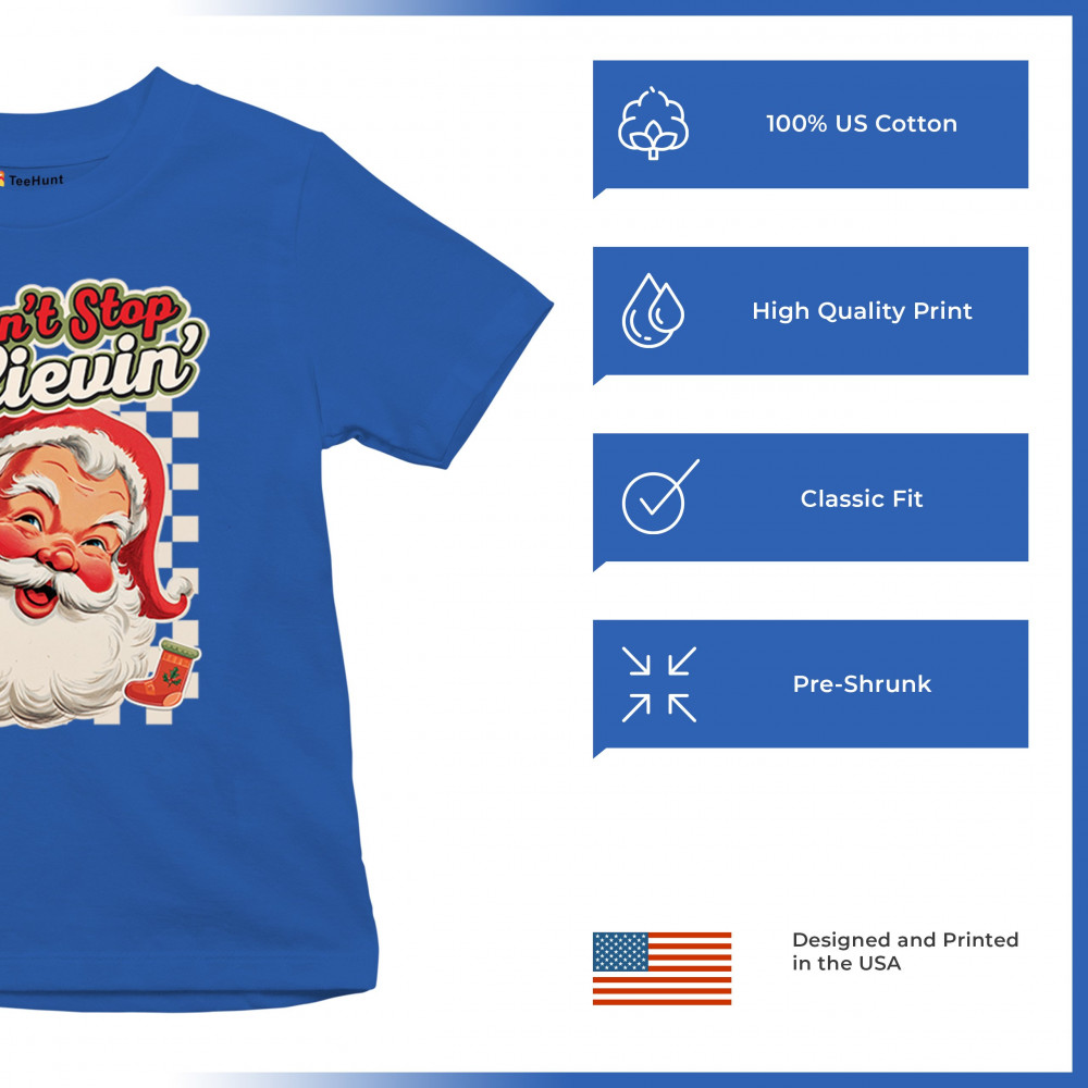 Spread holiday cheer with this “Don’t Stop Believing†Santa Claus shirt that blends classic Christmas spirit with cozy winter charm. Perfect for festive parties, family gatherings, or relaxing by the fire, this design captures Jingle Bells joy, Merry Xmas fun, Santa Claus magic, Reindeer delight, Rudolph glow, Snowman charm, and Christmas tree style for the perfect seasonal outfit.
