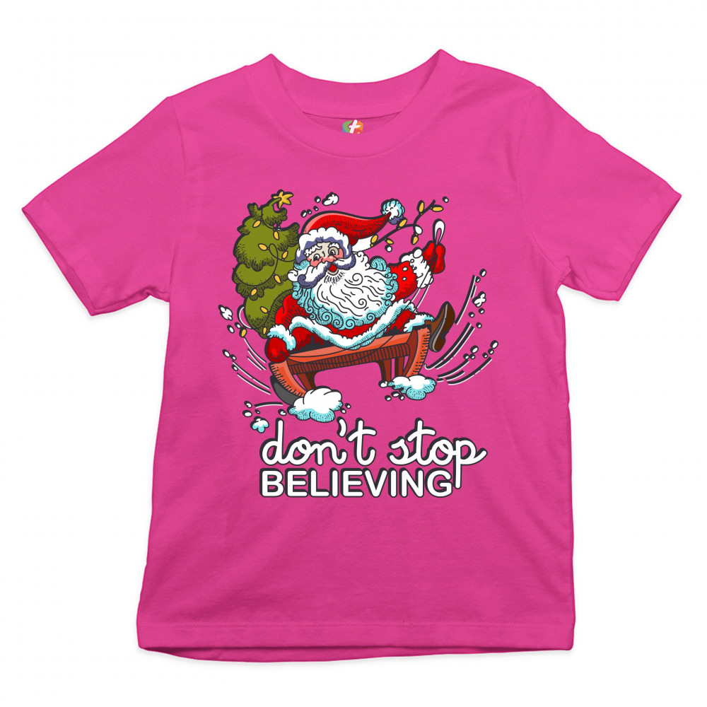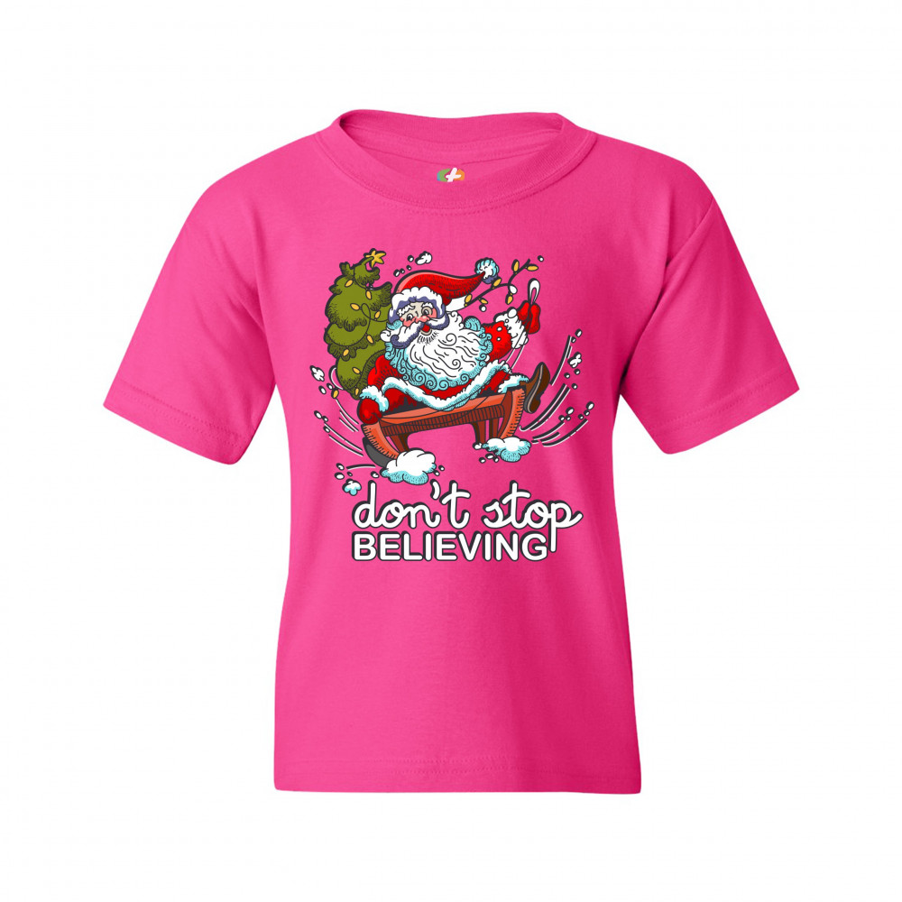 DON'T STOP BELIEVING youth t-shirt christmas holiday spirit santa claus kids pink