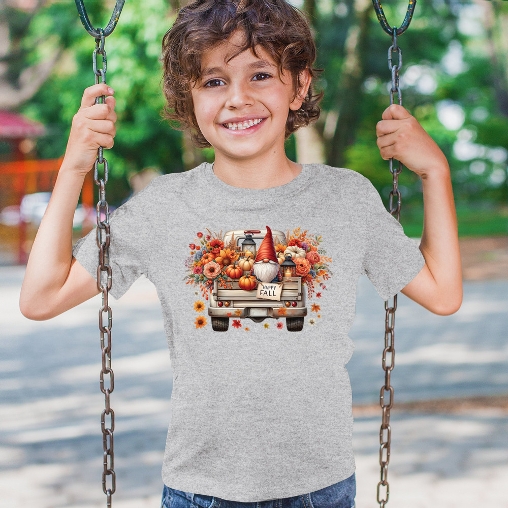 Rustic gnome truck design with pumpkins, wildflowers, and lantern glow. Perfect for Thanksgiving Day, farmhouse harvest, and cozy autumn style.