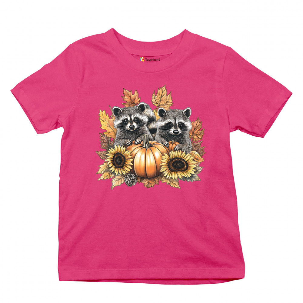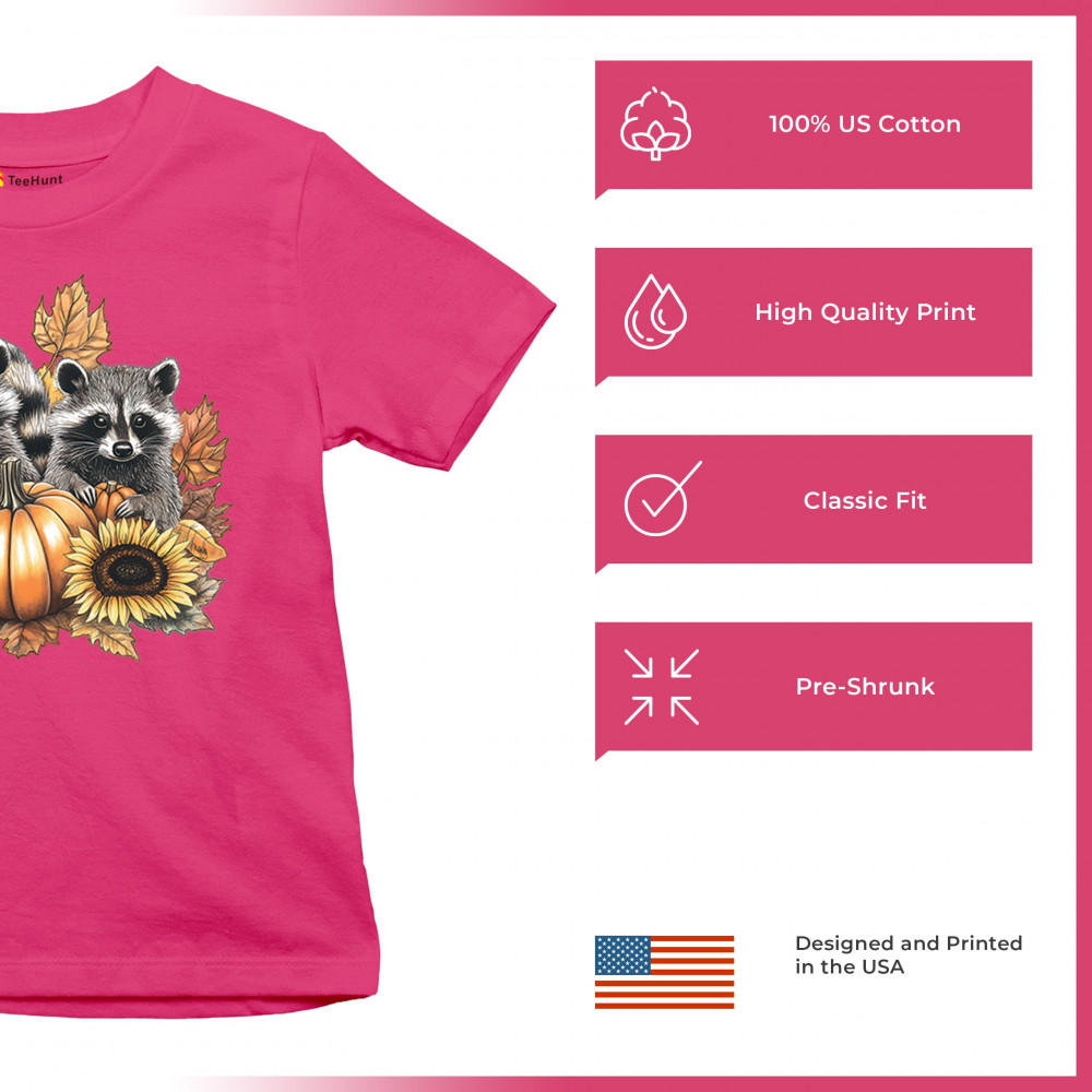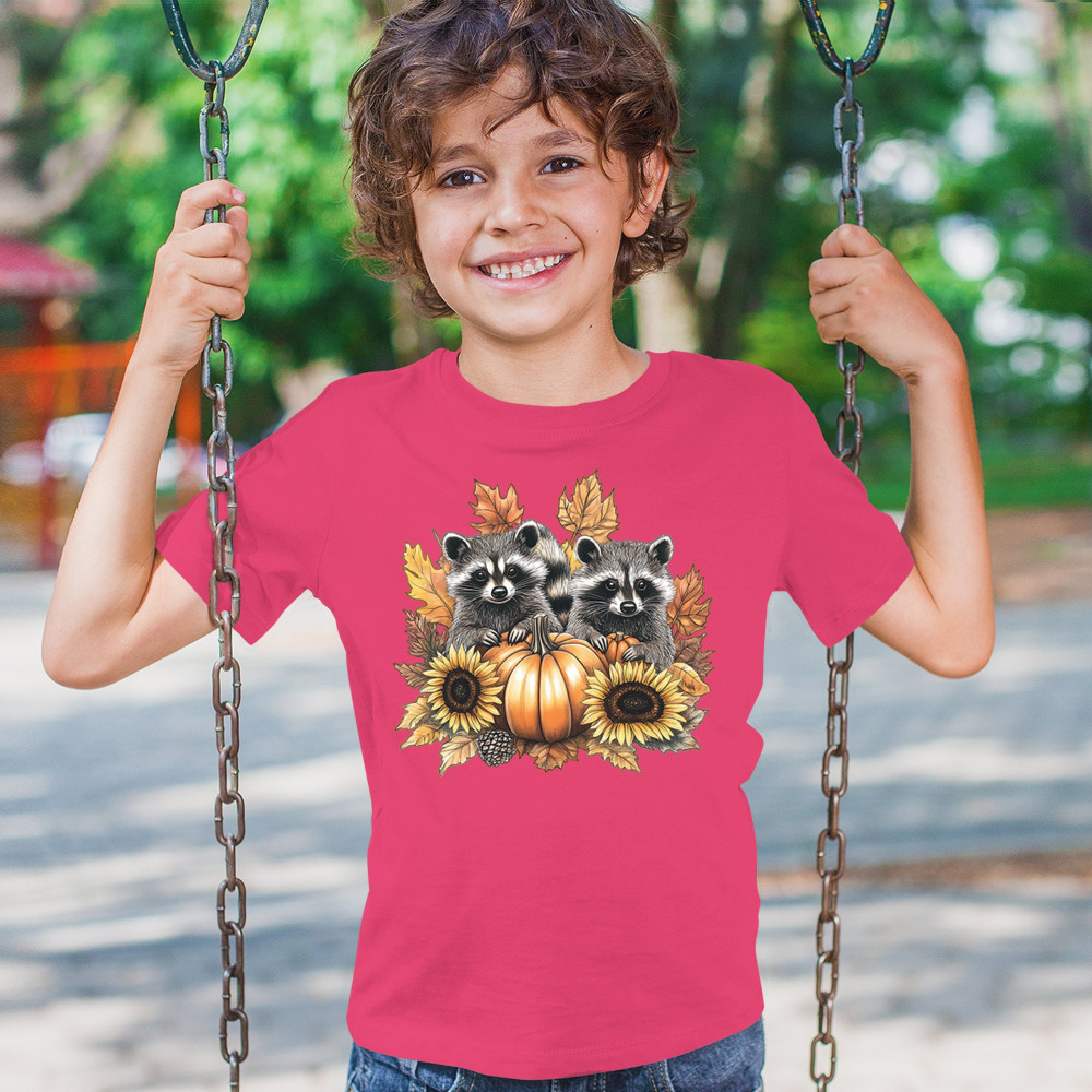 Rustic autumn raccoon design with pumpkins and sunflowers. Perfect for Thanksgiving, pumpkin patch days, farmhouse harvest, and woodland fall fashion.