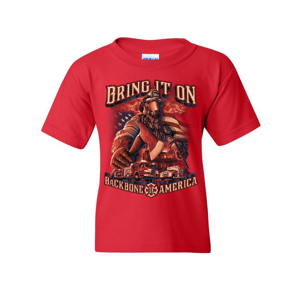 FIREFIGHTER BACKBONE OF AMERICA youth t-shirt fd fire and rescue hero kids tee red