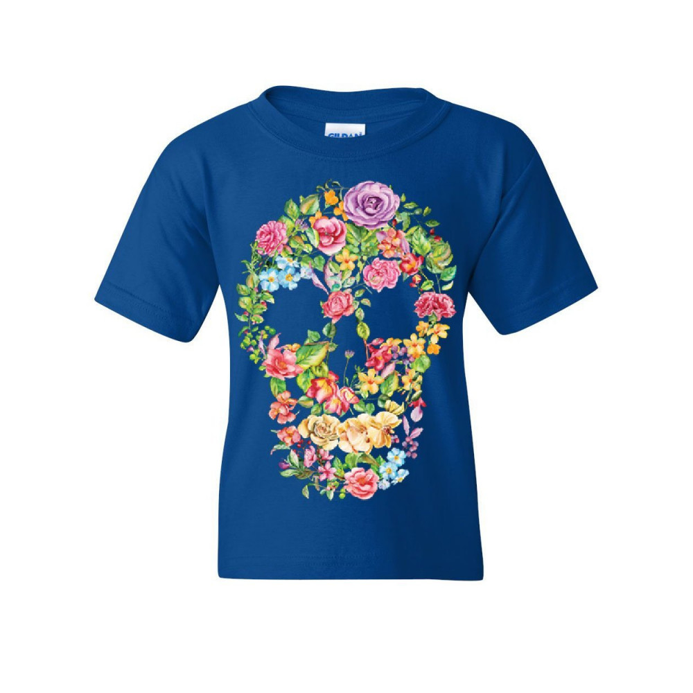 FLOWER SKULL youth t-shirt sugar skull calavera dia de los muertos kids tee royal blue