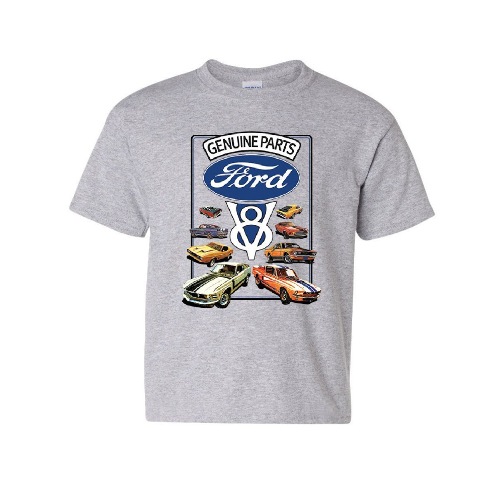 FORD GENUINE PARTS youth t-shirt american classic muscle cars v8 motor kids tee gray