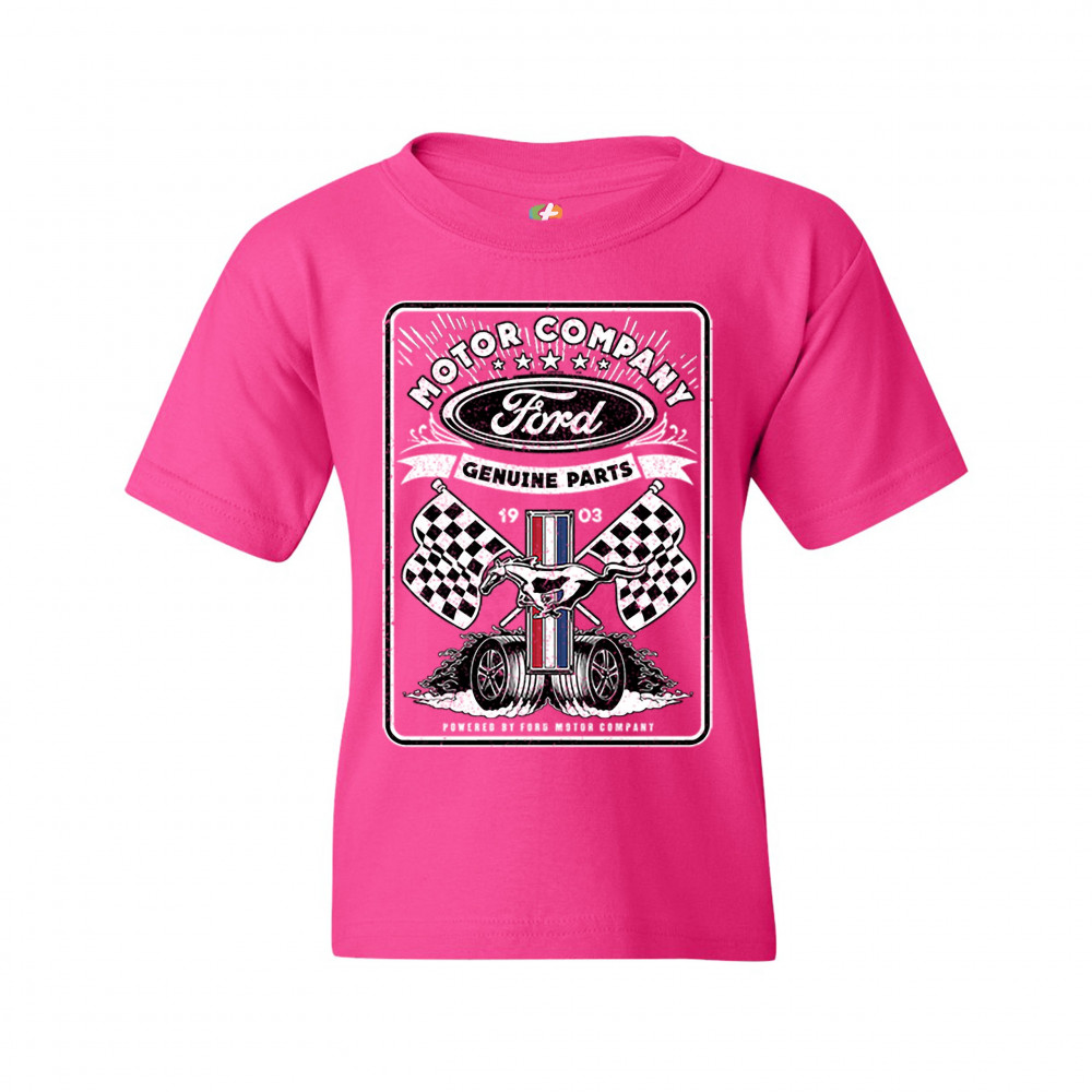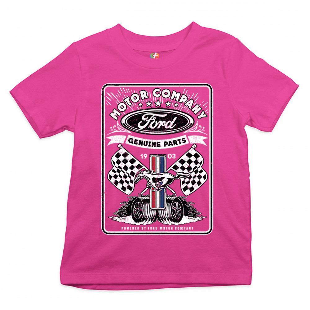 A print featuring Ford logo in the top, Mustang logo in the center, two racing flags and two rolling wheels. The prints says: "Ford Motor Company Genuine Parts 1903" in the top and "Powered by Ford Motor Company" in the bottom. A great choice for anyone w