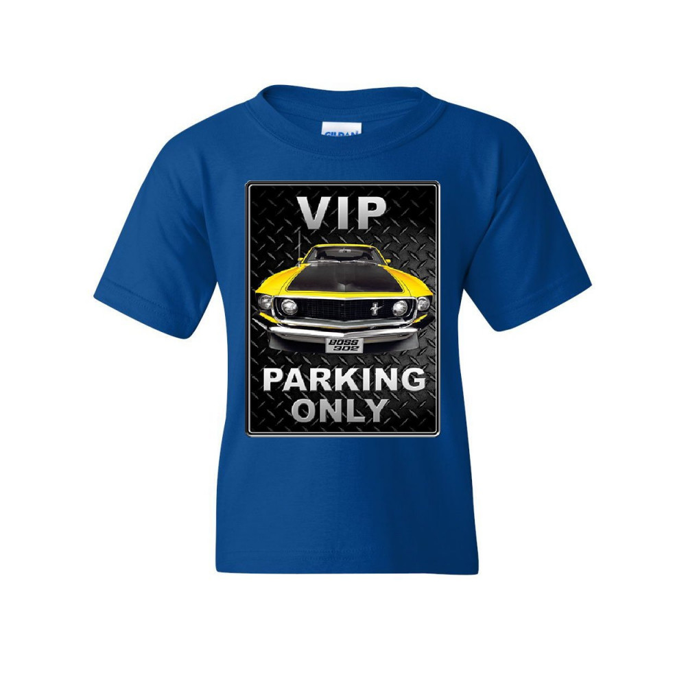 VIP PARKING ONLY ford mustang youth t-shirt yellow boss 302 muscle car kids tee royal blue