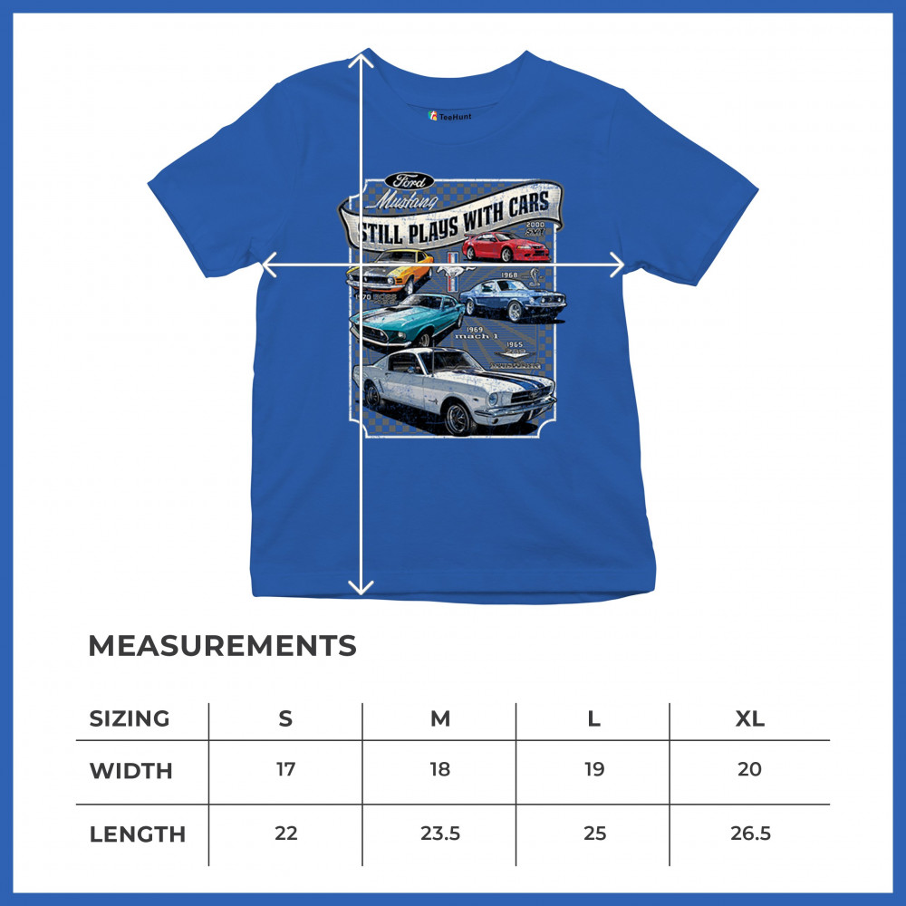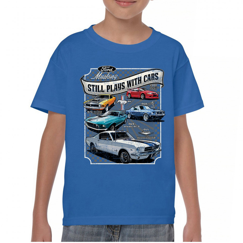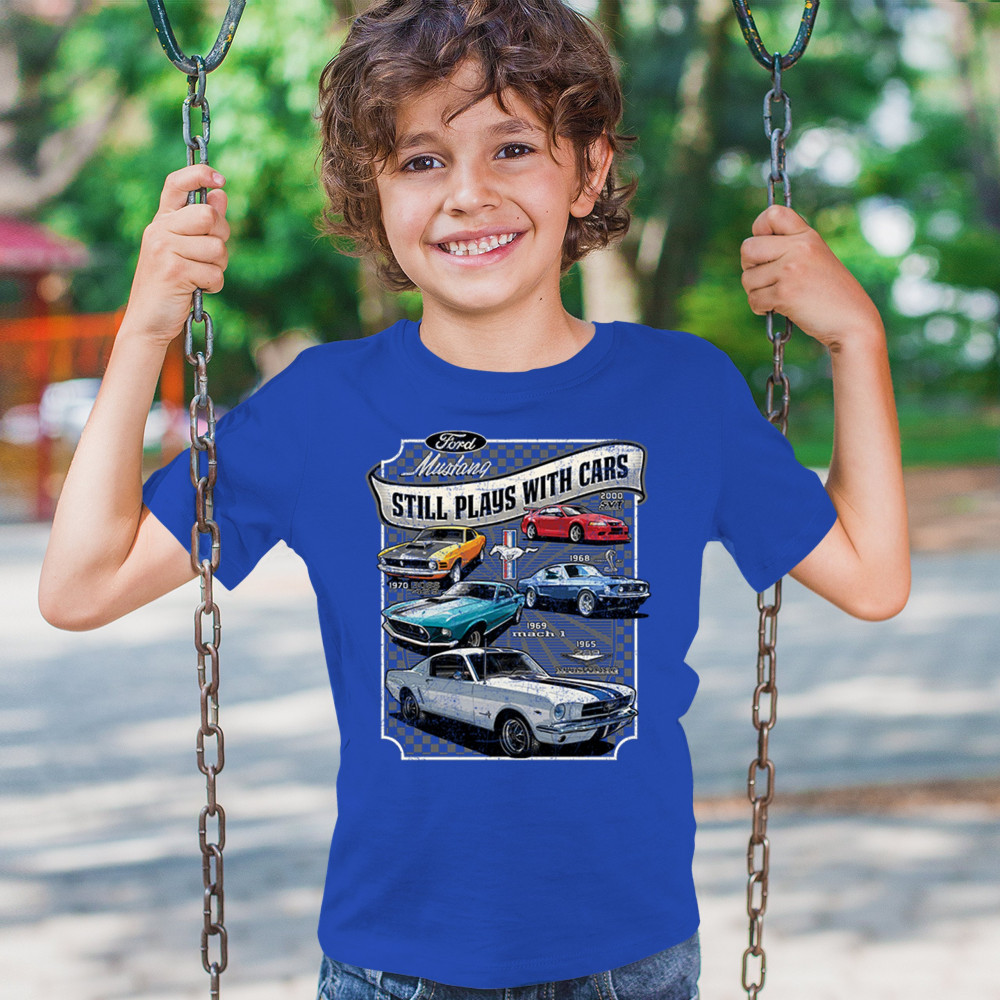 This bold Ford Mustang "Still Plays With Cars" design showcases six classic models from 1965 to 2000, including the 1969 Mach 1, 1970 Boss 302, and 2000 SVT. A dream graphic for muscle car lovers, collectors, and pony car fans. Great for classic auto shows, retro cruises, garage wear, or car clubs.