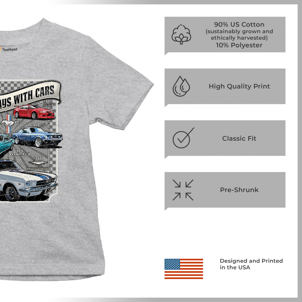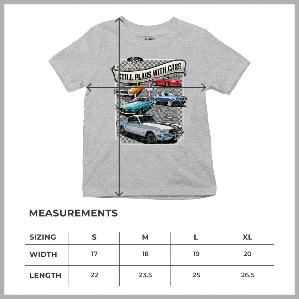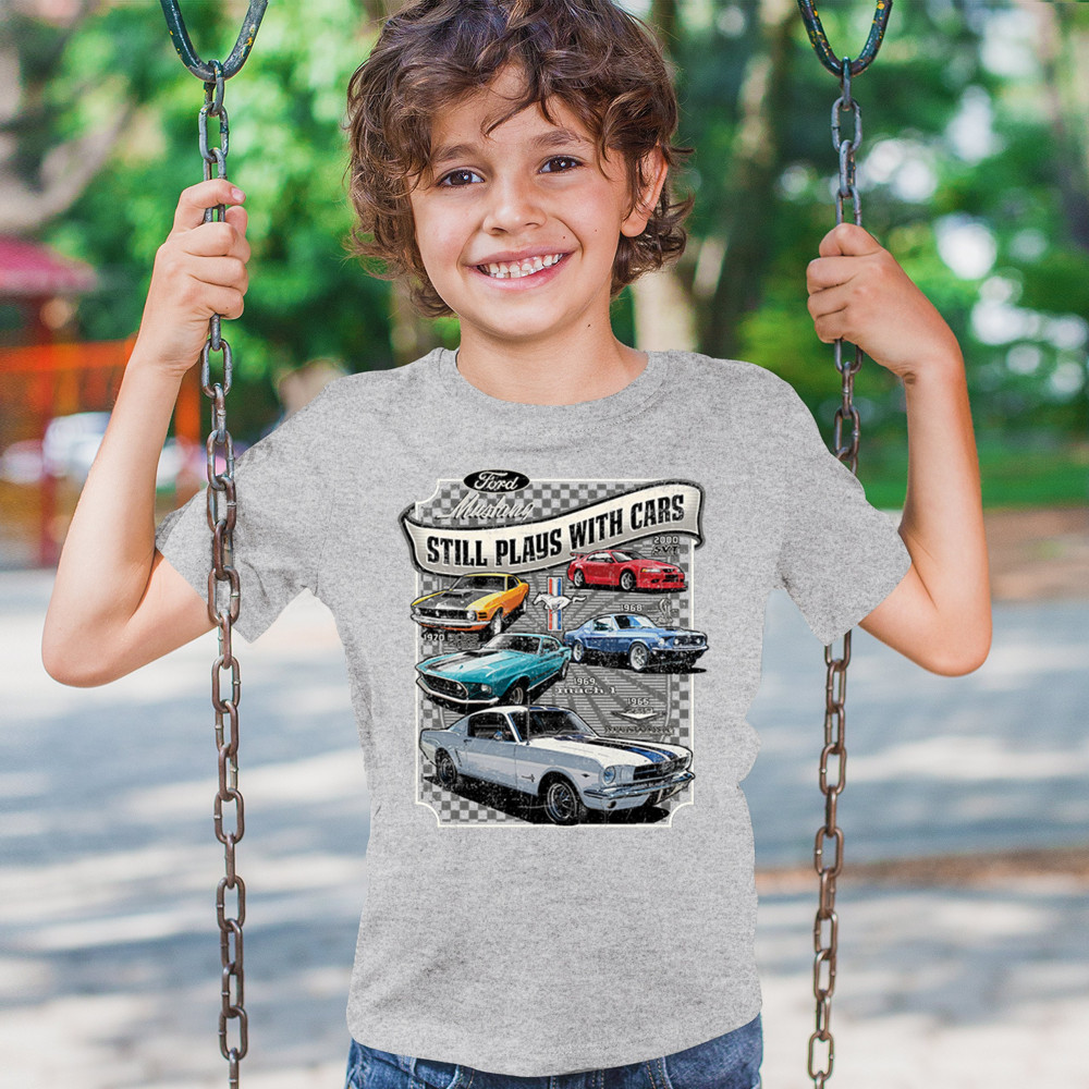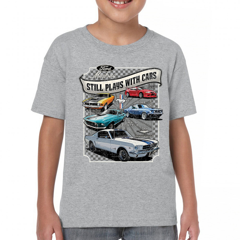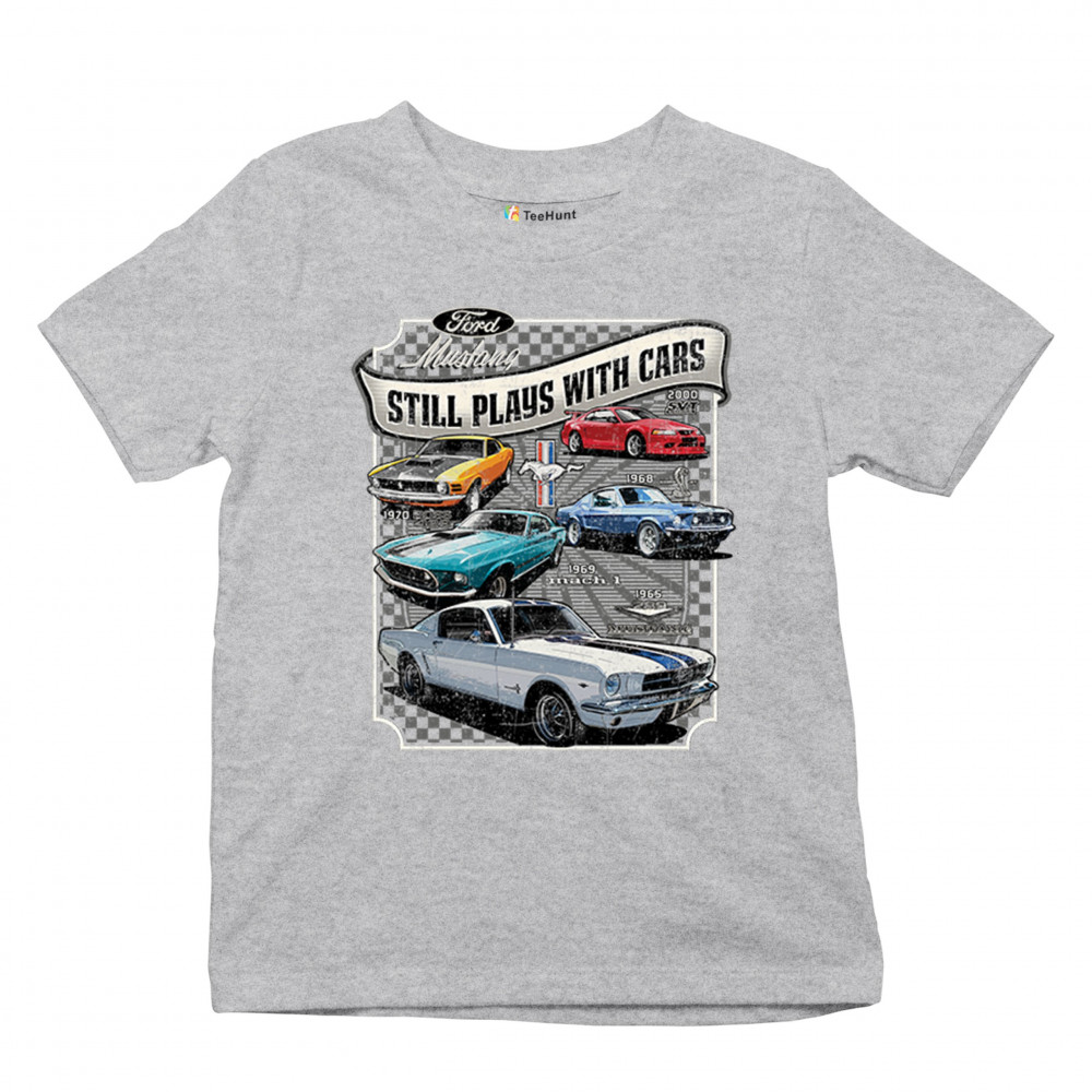 This bold Ford Mustang "Still Plays With Cars" design showcases six classic models from 1965 to 2000, including the 1969 Mach 1, 1970 Boss 302, and 2000 SVT. A dream graphic for muscle car lovers, collectors, and pony car fans. Great for classic auto shows, retro cruises, garage wear, or car clubs.