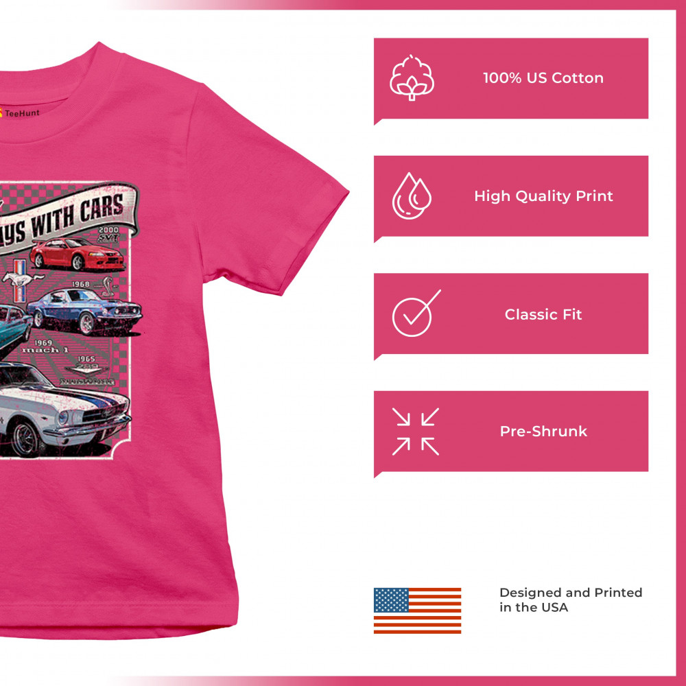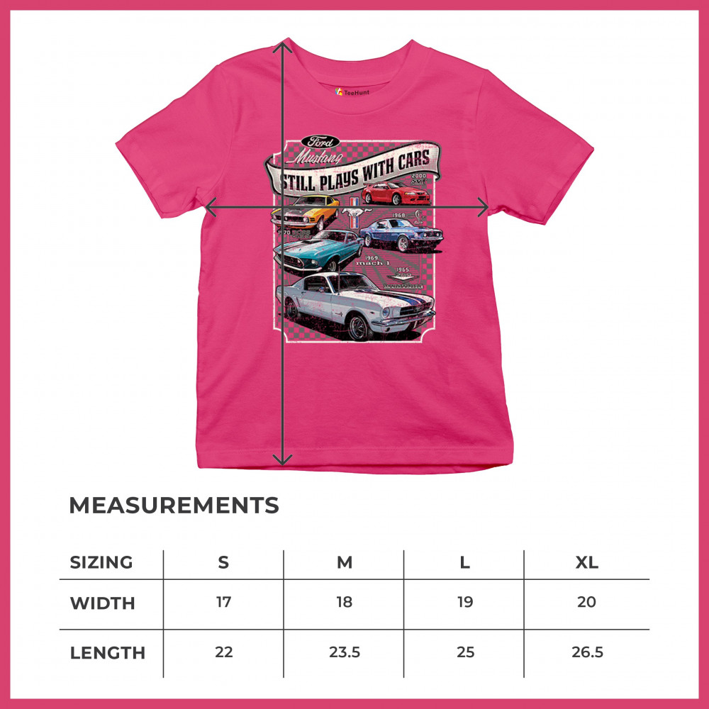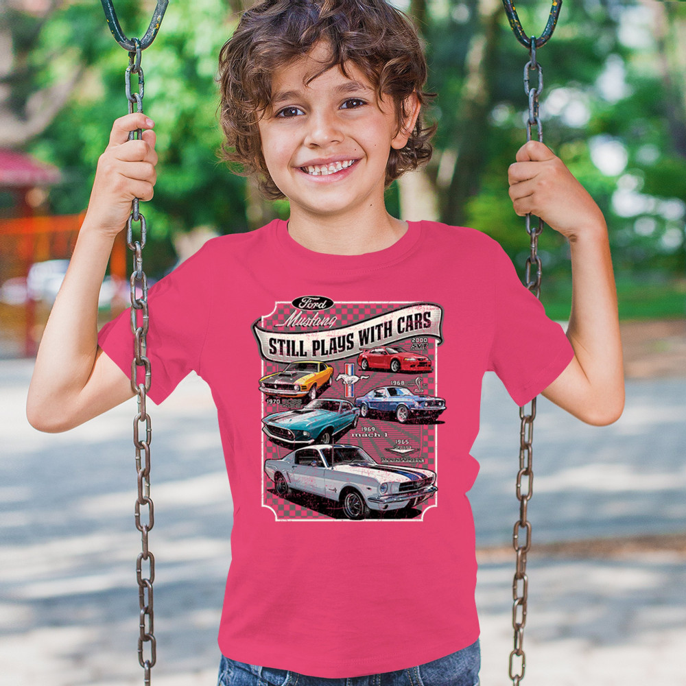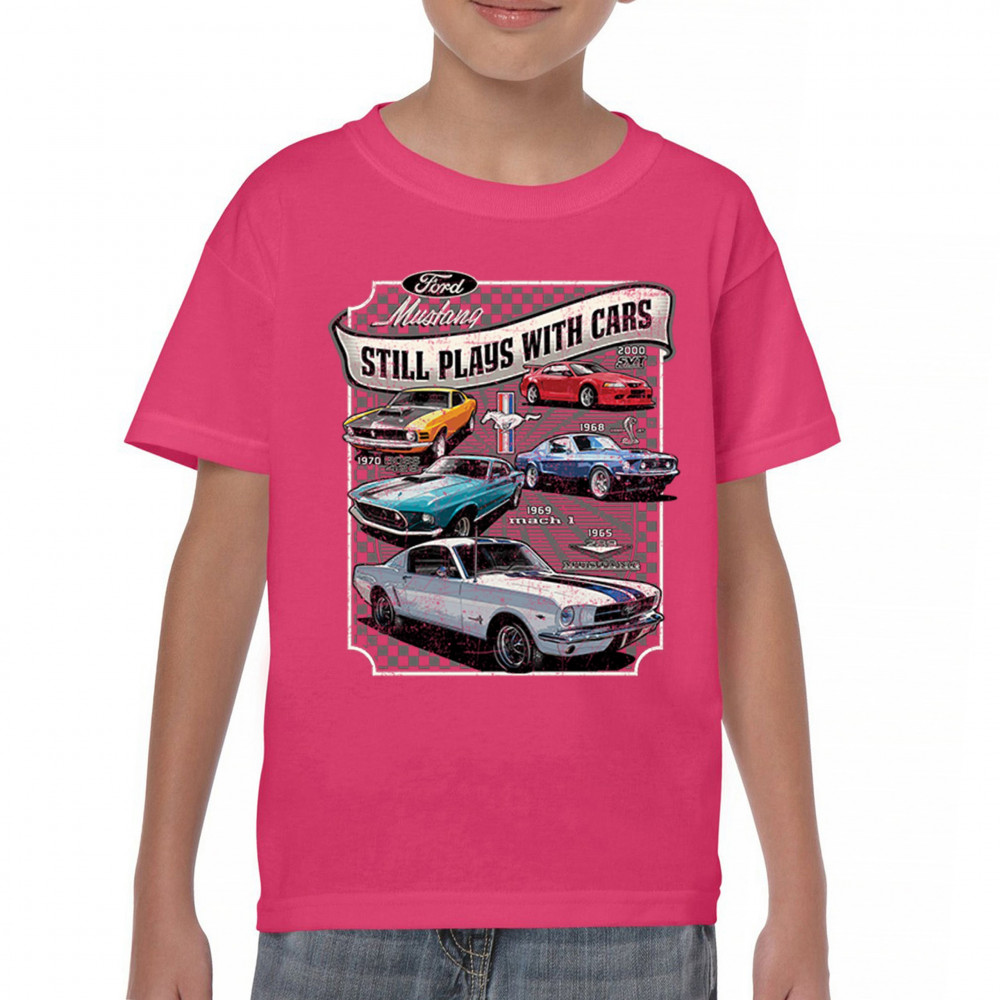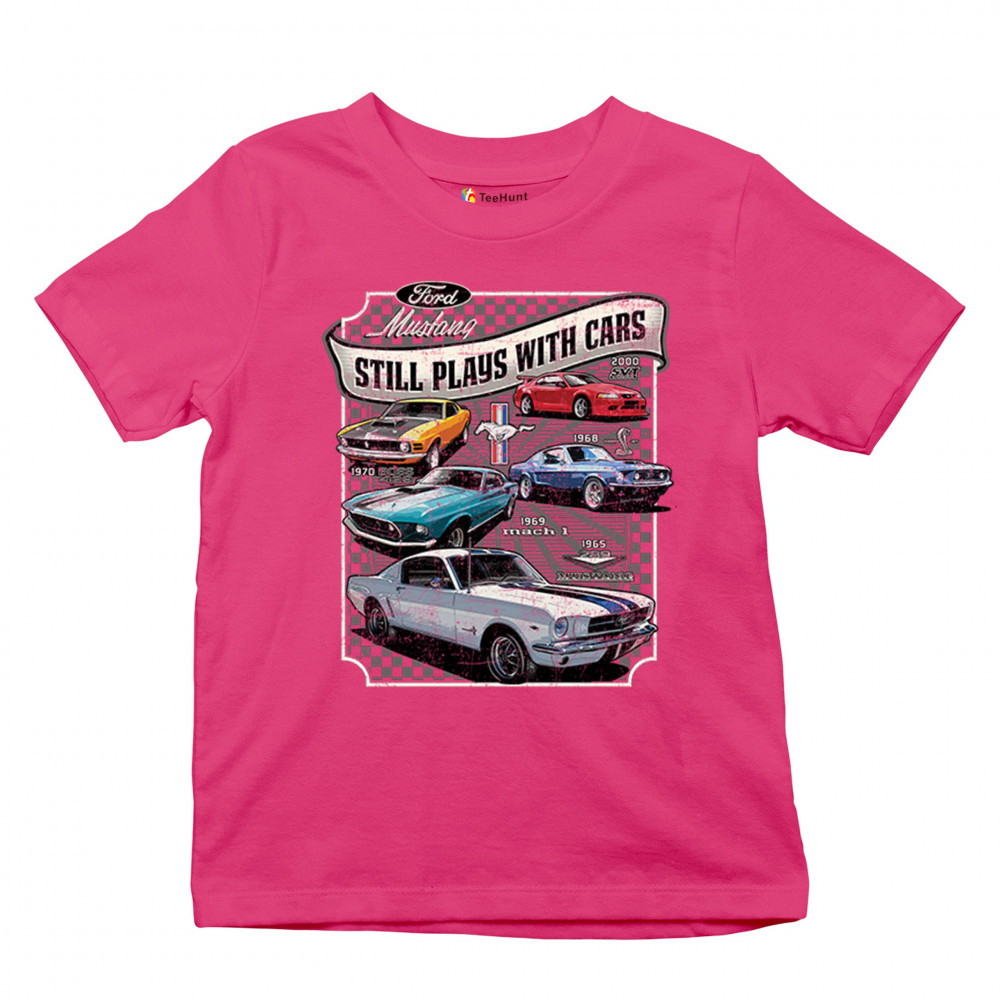 This bold Ford Mustang "Still Plays With Cars" design showcases six classic models from 1965 to 2000, including the 1969 Mach 1, 1970 Boss 302, and 2000 SVT. A dream graphic for muscle car lovers, collectors, and pony car fans. Great for classic auto shows, retro cruises, garage wear, or car clubs.