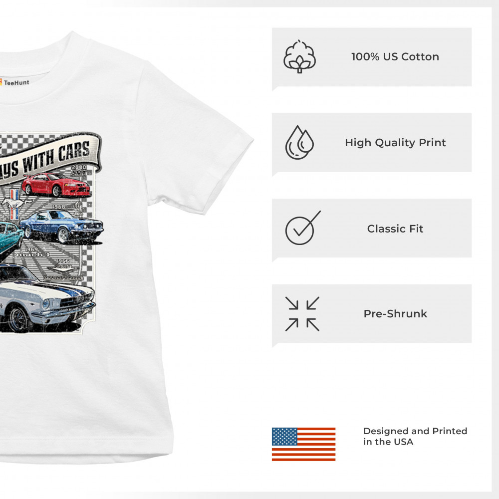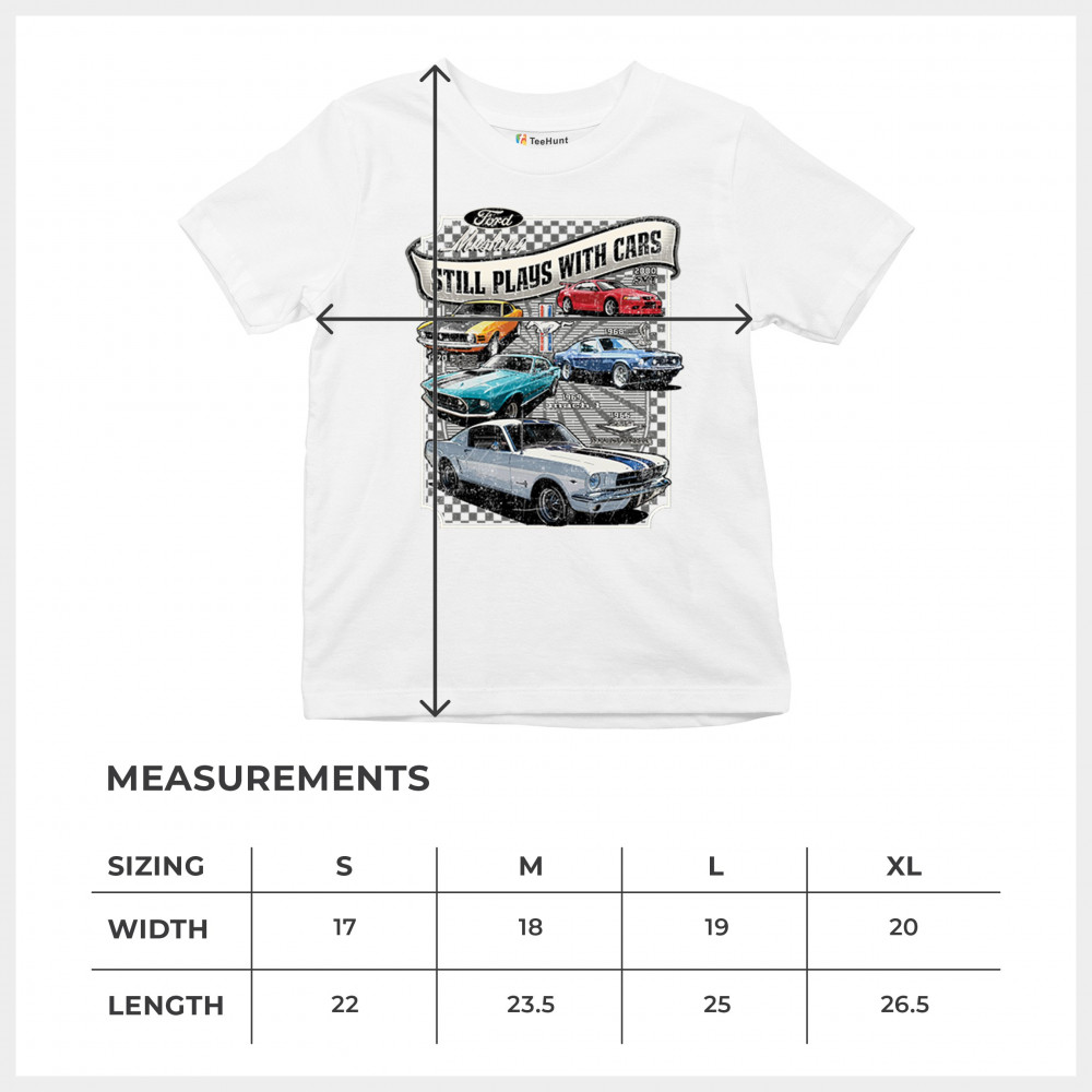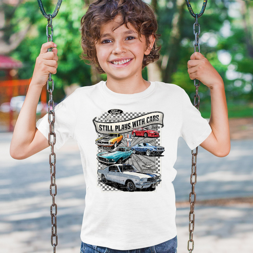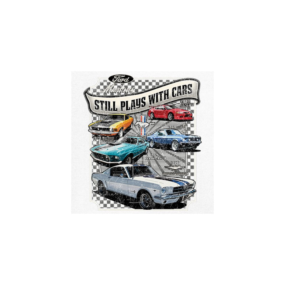 This bold Ford Mustang "Still Plays With Cars" design showcases six classic models from 1965 to 2000, including the 1969 Mach 1, 1970 Boss 302, and 2000 SVT. A dream graphic for muscle car lovers, collectors, and pony car fans. Great for classic auto shows, retro cruises, garage wear, or car clubs.