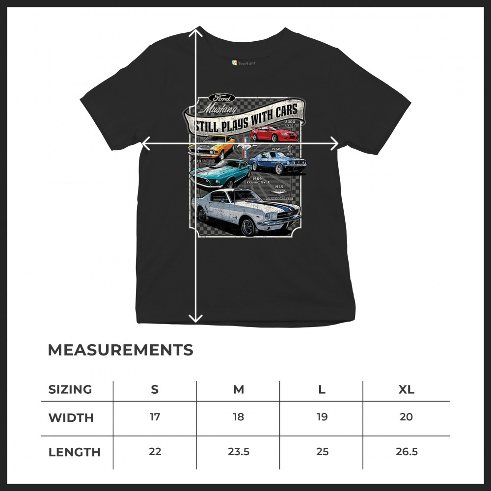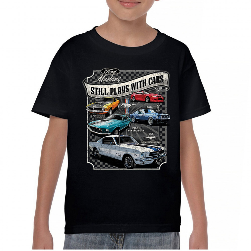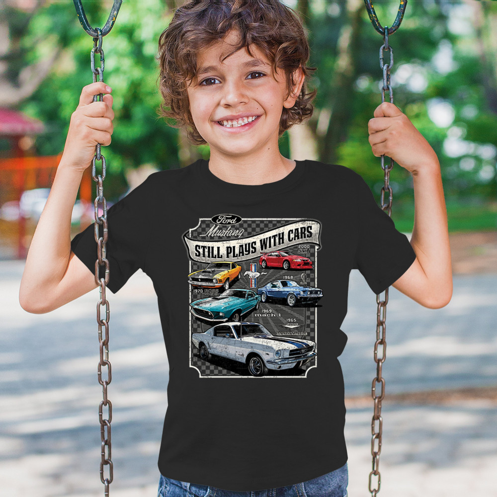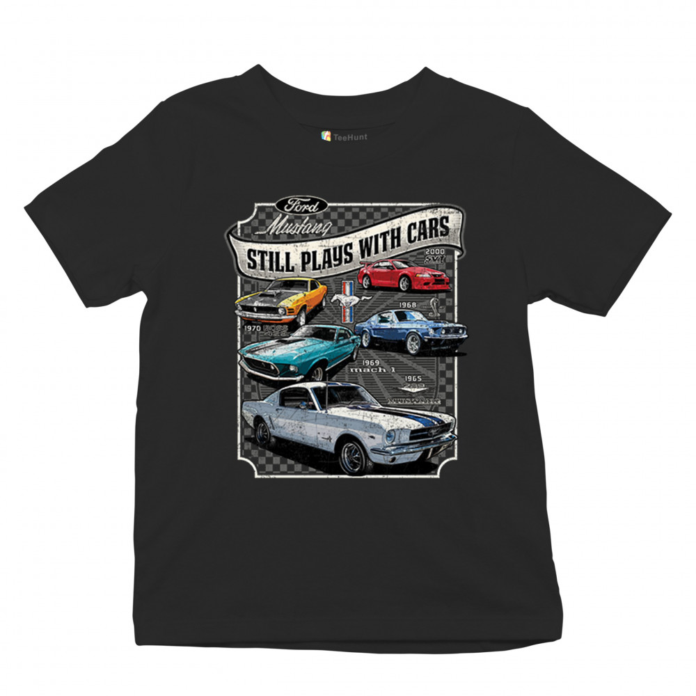 This bold Ford Mustang "Still Plays With Cars" design showcases six classic models from 1965 to 2000, including the 1969 Mach 1, 1970 Boss 302, and 2000 SVT. A dream graphic for muscle car lovers, collectors, and pony car fans. Great for classic auto shows, retro cruises, garage wear, or car clubs.