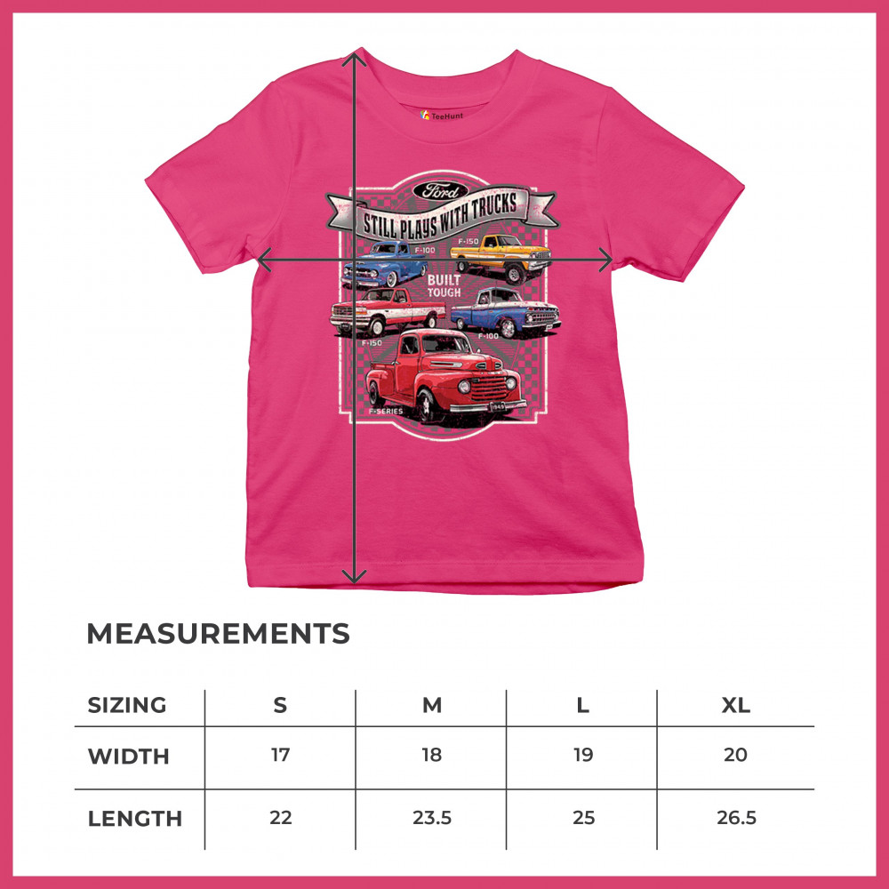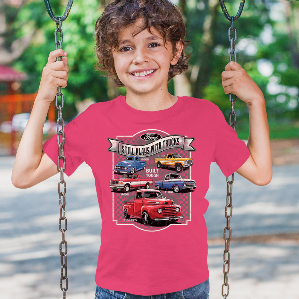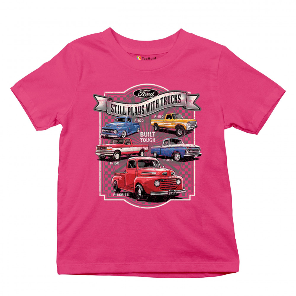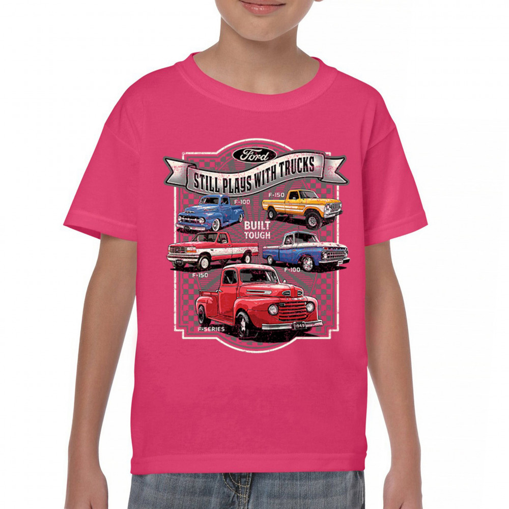 Features classic Ford F-Series trucks from 1949 to F-150. Great for vintage truck fans, garage wear, car shows, and collectors who love pickups.