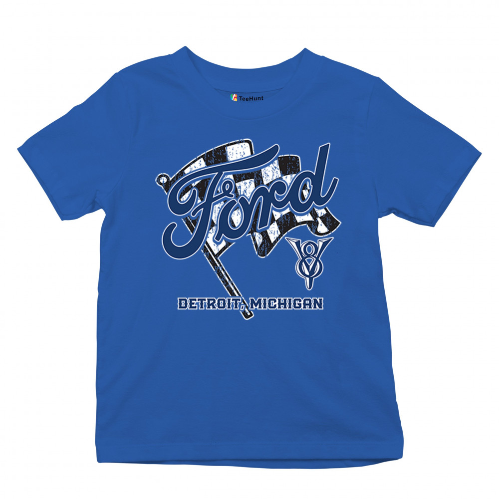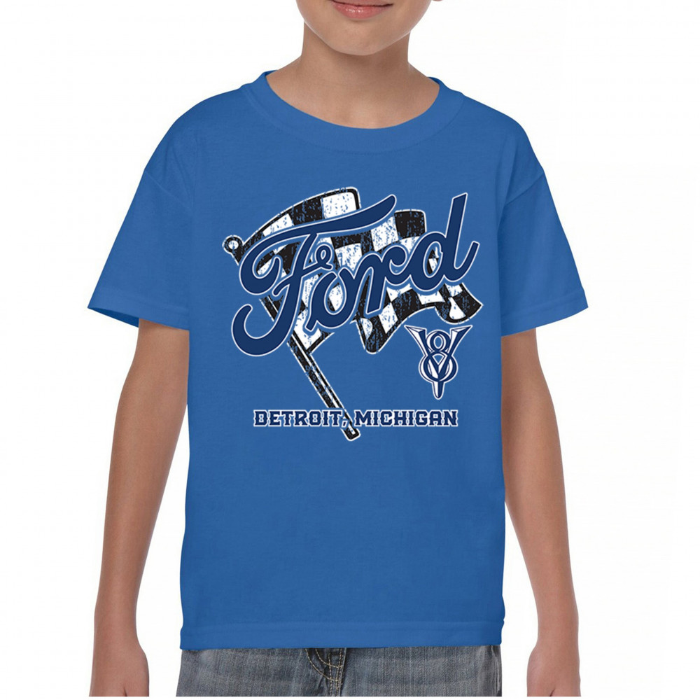 Honor Detroit, Michigan’s Ford legacy with this officially licensed design featuring a checkered flag and bold V8 emblem, perfect for muscle car fans and classic car lovers.