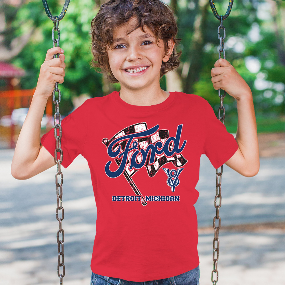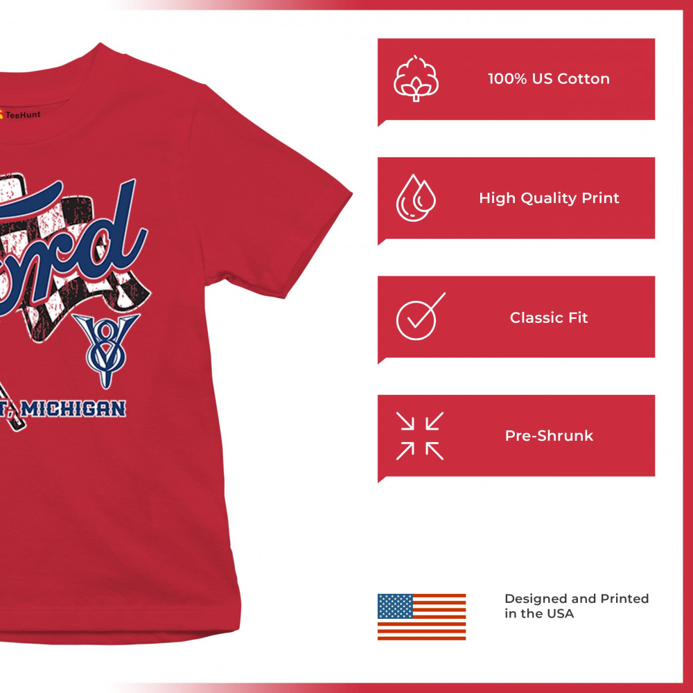 Honor Detroit, Michigan’s Ford legacy with this officially licensed design featuring a checkered flag and bold V8 emblem, perfect for muscle car fans and classic car lovers.