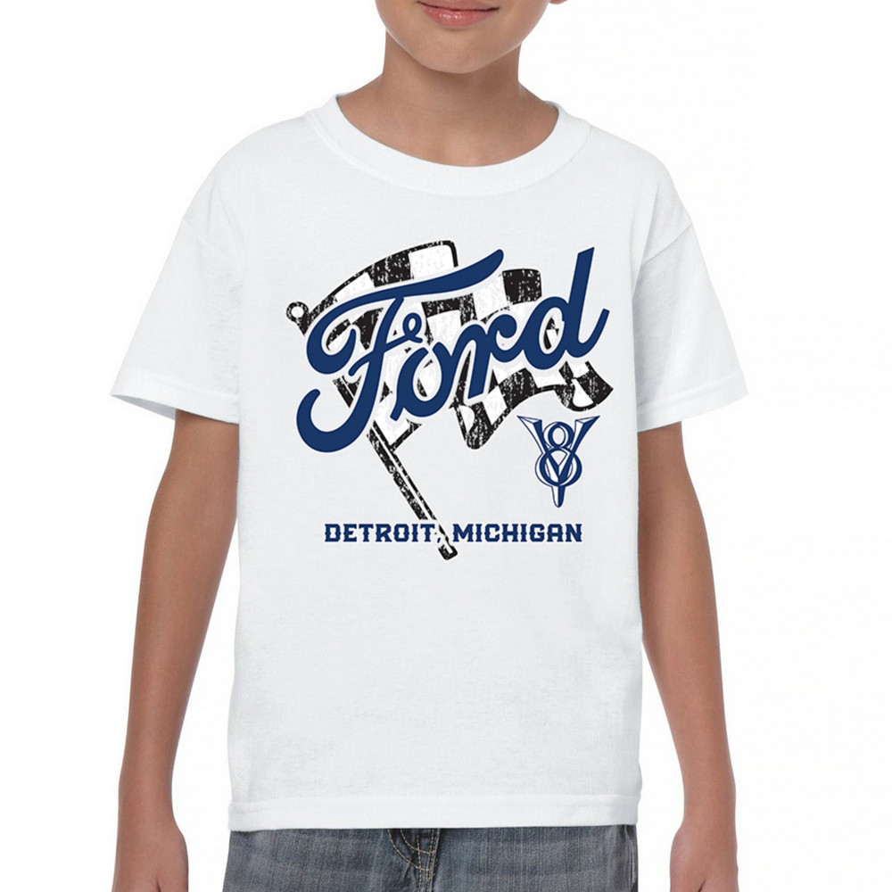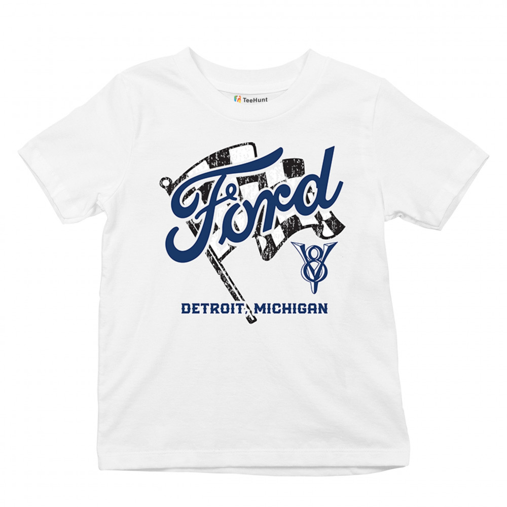 Honor Detroit, Michigan’s Ford legacy with this officially licensed design featuring a checkered flag and bold V8 emblem, perfect for muscle car fans and classic car lovers.