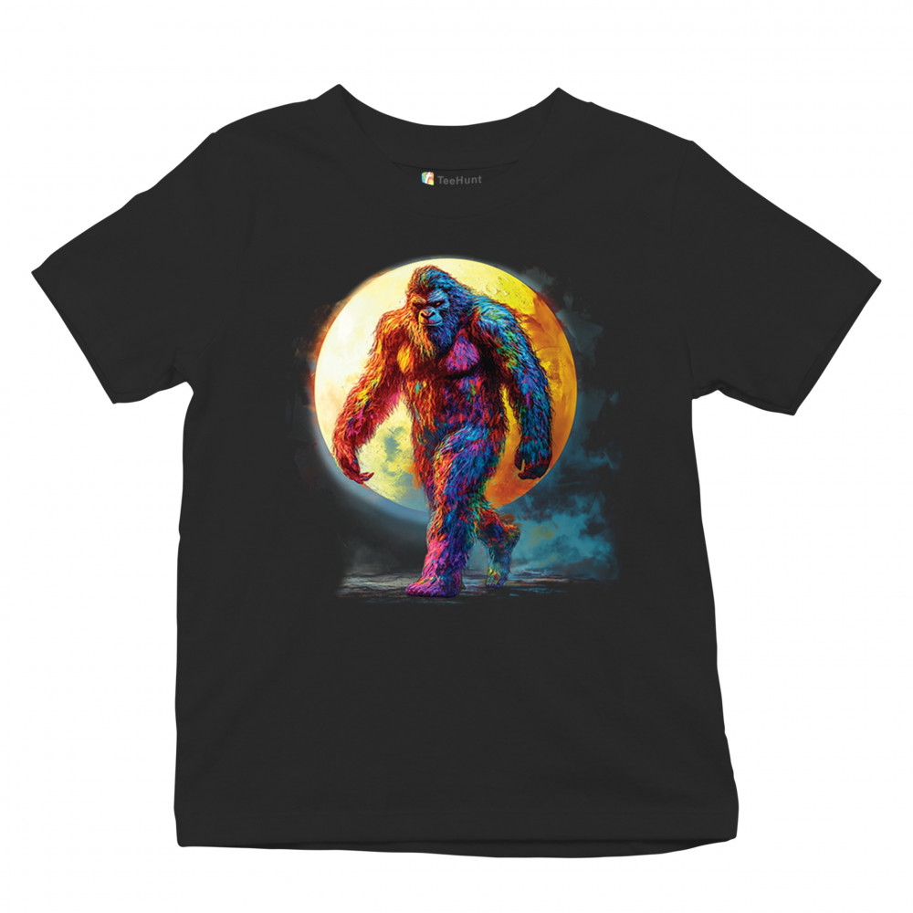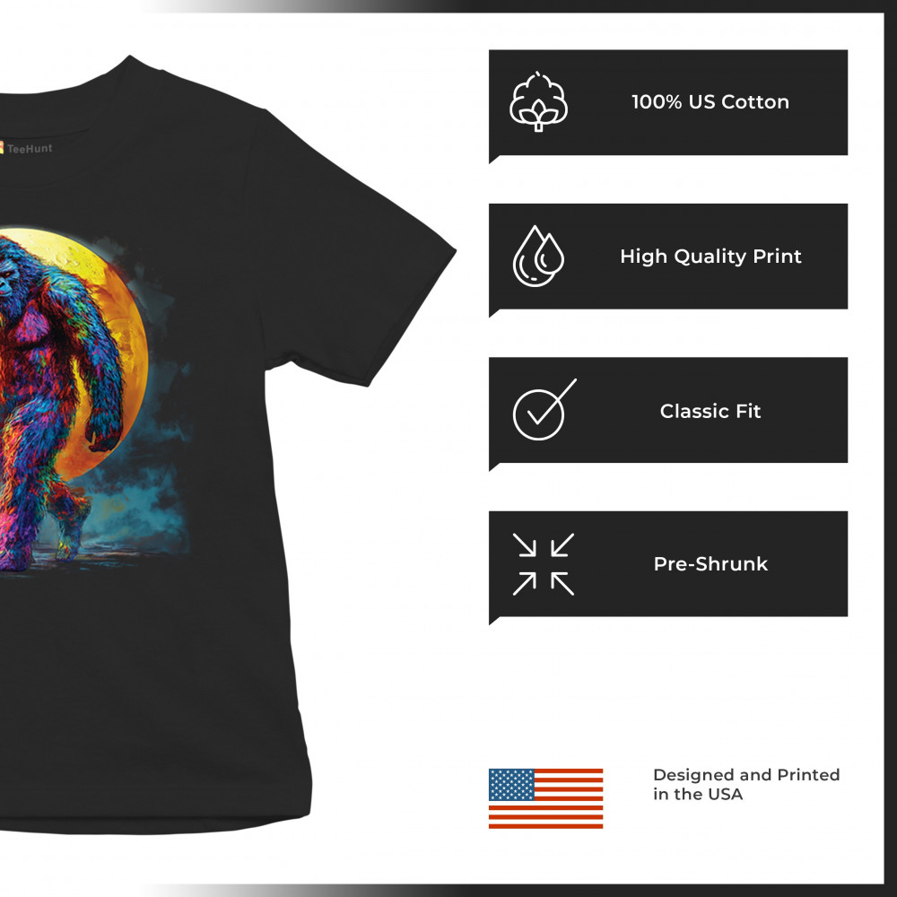 Rainbow Bigfoot under full moon design for cryptid lovers, festival goers, and psychedelic art fans. Bold, surreal, and eye-catching.